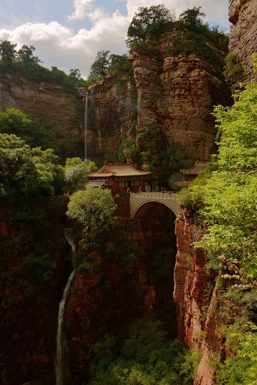 苍岩山风景区的核心是“苍岩三绝”:一绝“桥殿飞虹”。桥横驾于百仞峭壁之间,仰视蓝天一线,俯首万丈深渊。桥的形制如同赵州桥的敞肩拱式,桥上建楼,楼内建殿。赵朴初题诗:举头楼阁虚空现,低手云梯万丈悬。峭壁丹青凭点画,天宫人巧创奇观。