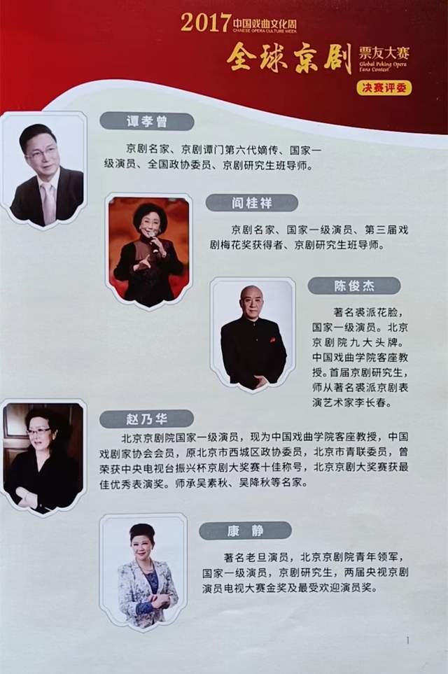 全球京剧票友大赛是2017年中国戏曲文化周的重要活动之一。大赛以“全球视野·精彩赛事·京韵悠远·薪火相传”为主题,通过群众的广泛参与,传承和普及戏曲艺术、展示中华传统文化的独特魅力。多位业界知名专家,如著名京剧老生及谭门第六代嫡传人谭孝曾、著名京剧演员闫桂祥、陈俊杰、富博洋、康静等担任本届大赛评委。