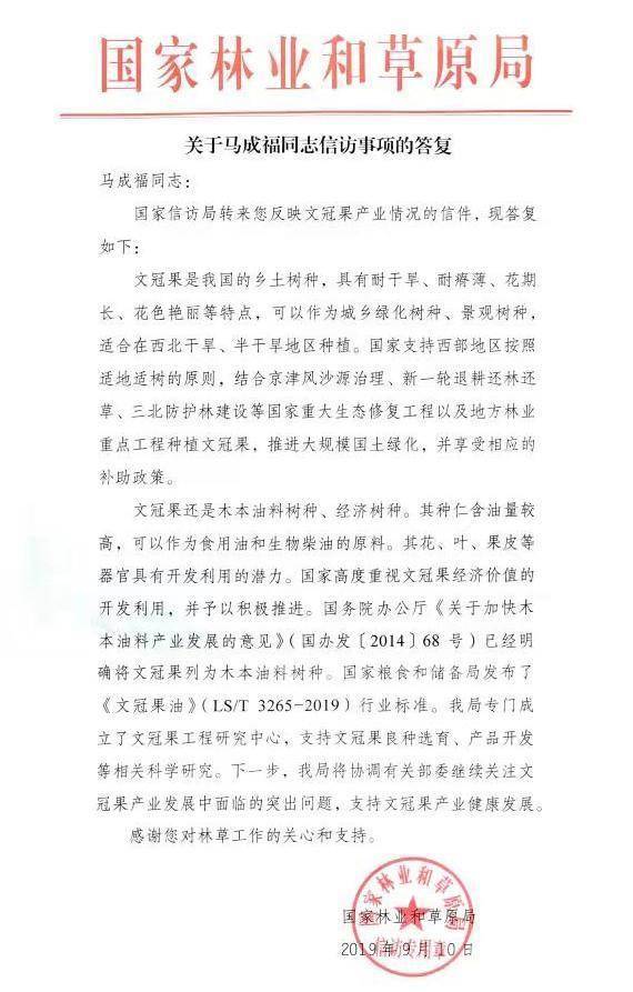9月10日,国家林业和草原局正式回信答复马成福: