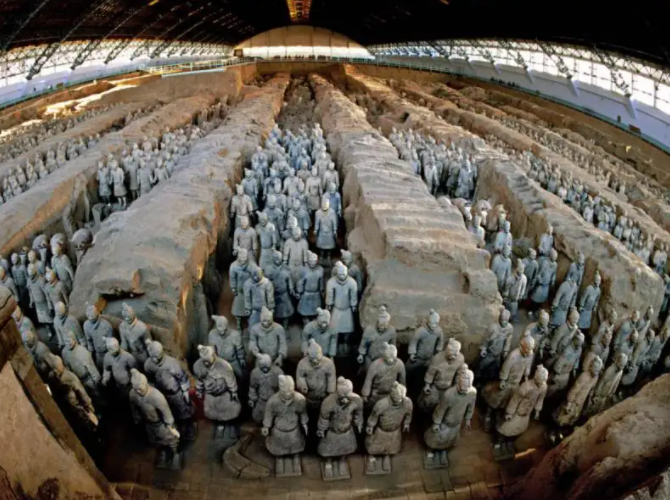 在我有限的见闻内,所知最早咏兵马俑之诗,是清代不著名的诗人黄航的《观秦兵马俑杂感》,其中的“冢下绝无藏匕客,何须兵马俑三千”,不失为调侃讥嘲的好句。新诗呢?印象最深的是余光中写于1988年的《秦俑》,他在港台观看展览的秦俑而作。“黑阒阒禁闭了两千年后/约好了,你们在各地出土/在博物馆中重整队伍/眉目栩栩,肃静无哗的神情/为一个失踪的帝国作证”,时空交感,虚实相参的想象,是余诗的独门绝技。2014年8月,他在西安算是实地新来,在留言簿的题词是:“一锄锄,找回/一个失踪的帝国/我似乎听见秦始皇在咳嗽。”其中,重复了他近三十年前的旧作中的得意之句。