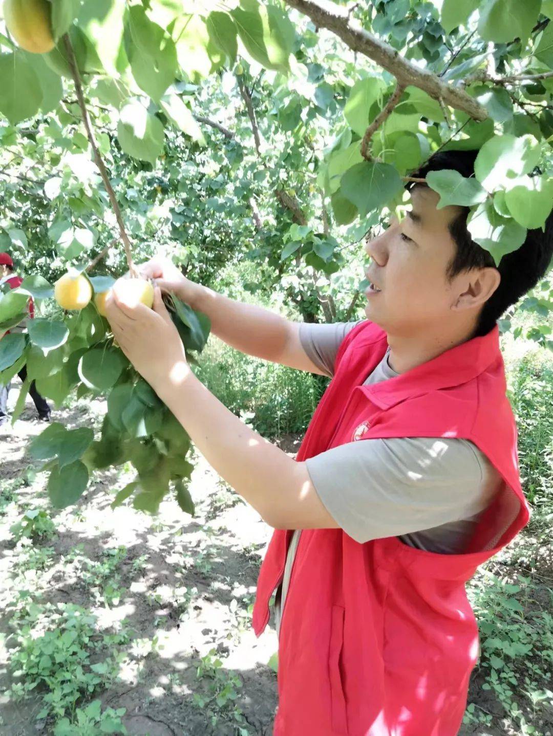 石家庄一家人志愿者团队鹿泉分队负责人牛振河看到这种情况也很是替农民朋友们着急,今天早上8点,他就带领几名志愿者来到采摘园,帮农民采摘大杏,同时帮忙销售。