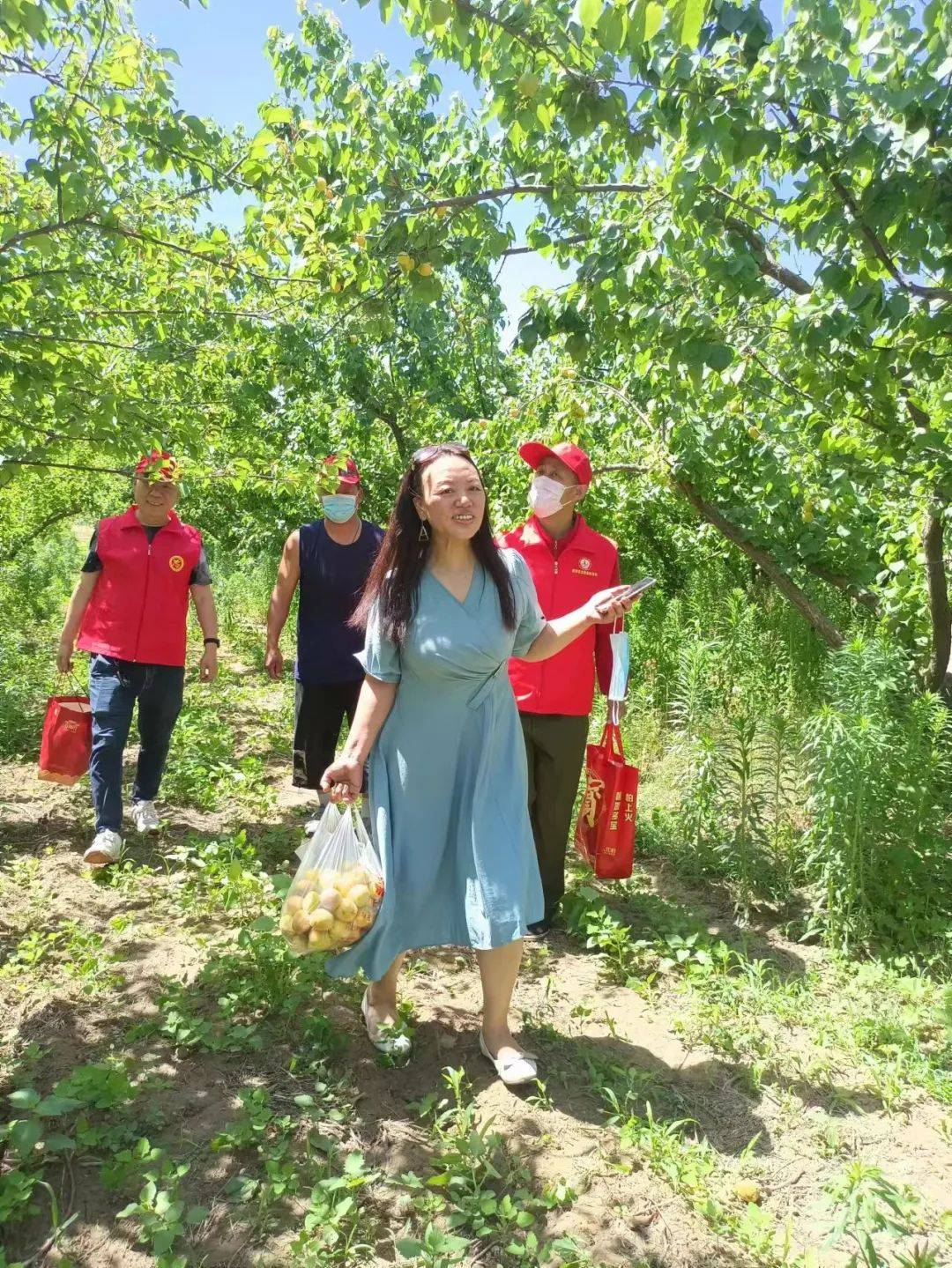 志愿者们顶着烈日,加紧采摘,今天共摘大杏1200多斤。随后志愿者们帮助农民朋友卖杏,卖出1108斤,共收入5540元。到现在还有约5000来斤没有卖出,在这希望喜欢吃杏的朋友到采摘园观光采摘。