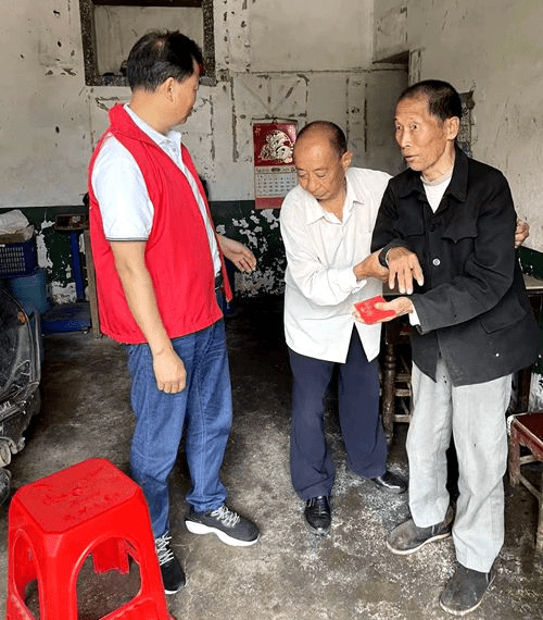 首先,志愿者们来到泉塘镇南薮村困难老人、帕金森病患者朱志光家中进行慰问,朱老是“湖南好人”谷正平多年来义务理发和帮扶的对象,他右眼失明,走路不协调。志愿者们送上爱心款,谷正平现场为朱老理发。