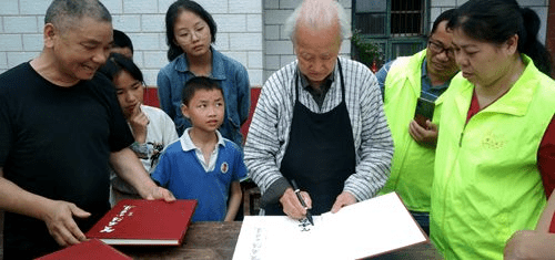 贺安得老人向志愿者赠送个人作品集,志愿者易军湘将个人著作《红叶不曾完美》赠送给贺老。志愿者们纷纷表示要向贺安得老人学习,学习他4年来义务奉献关爱留守儿童的先进事迹 。