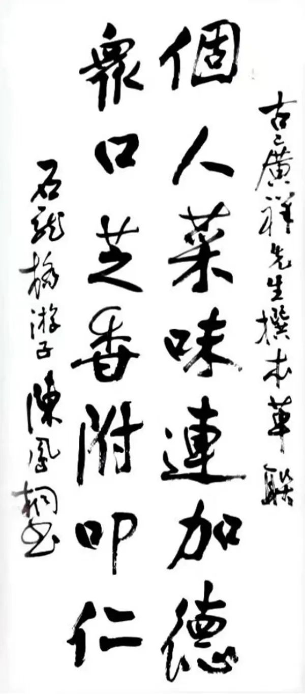 被毛主席称为“党内一支笔”的舒同是陈凤桐心中的偶像,中国书法家协会第一次代表大会期间,陈凤桐曾去北京会议处向书法家们征稿、请益编选《当代楹联墨迹选》。因当时舒同工作繁忙,未能与其见面,陈凤桐深感遗憾。后来,他把书的样本通过别人寄给舒同,舒同认真阅读后,欣然操笔,题“百花齐放,推陈出新”(见附图)鼓励,并题“当代楹联墨迹选”书名。