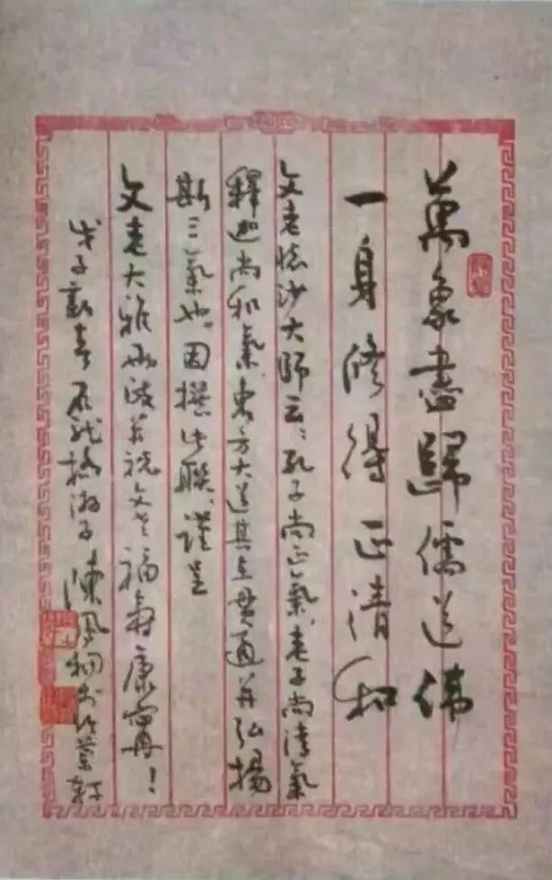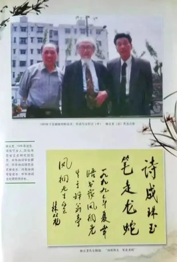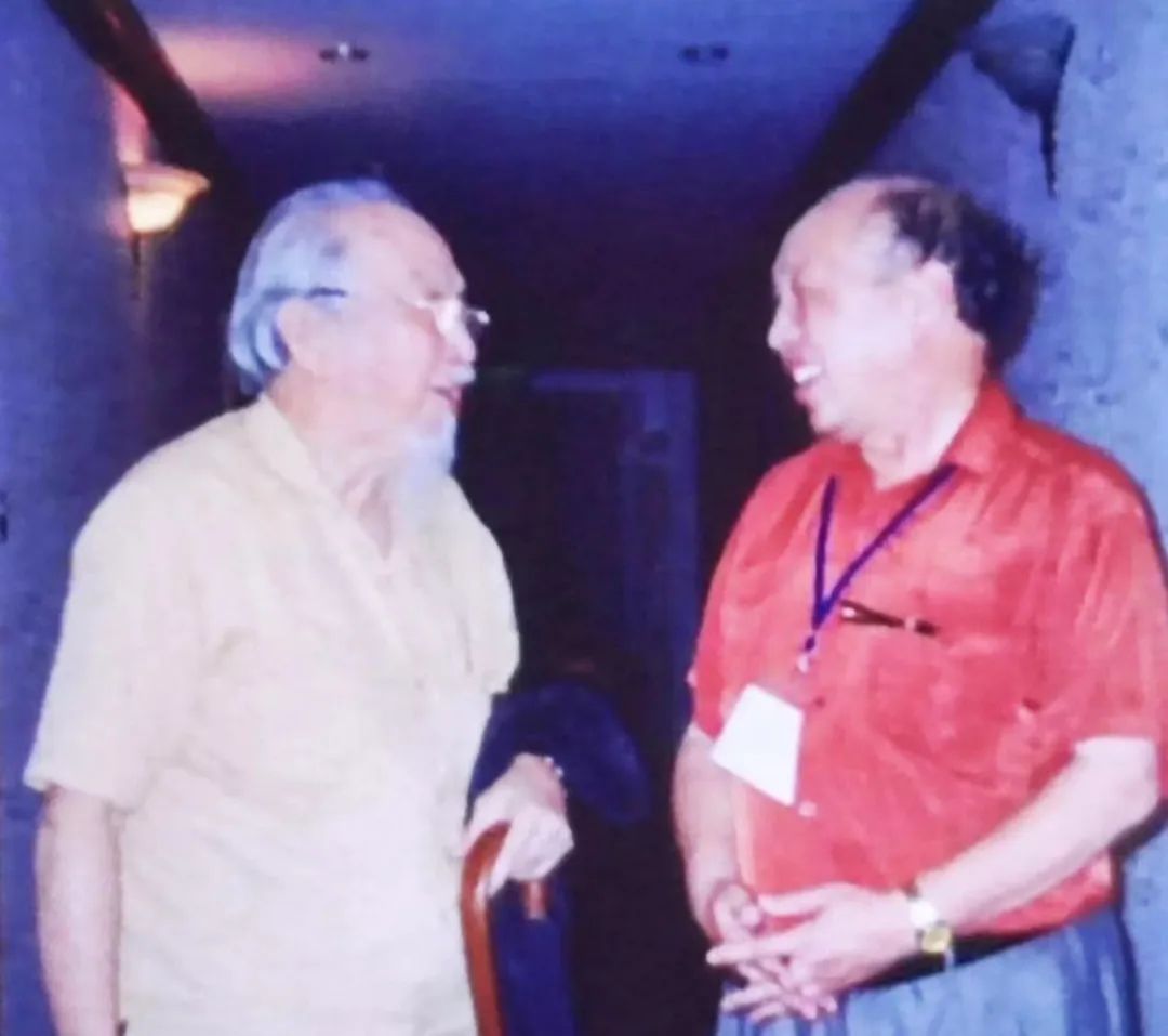 该年秋,文怀沙在辽宁调兵山举办佛学文化活动,陈凤桐应邀前往学习、取经。这次活动规模巨大,来自海内外的人士众多。老朋友久别重逢,格外亲切,文怀沙握着陈凤桐的手,问长问短,陈凤桐的随行用相机抓拍了当时他与文怀沙相见时的情景,留下了人生珍贵的一瞬。活动结束,代表们合影留念时,陈凤桐站在文怀沙的身后,因对文怀沙太过崇拜,想尽量靠文先生近一些,一不小心,脚下踩滑,重重地摔在大理石地面上,将左腿摔伤,被送进医院治疗近30日,伤势才痊愈。对于这次意外,陈凤桐无怨无悔,用“我遣仄平抒感慨”这样的诗句,纪念这段难忘的经历,这位痴情文化艺术事业达人忘我的精神,真是令人钦佩。