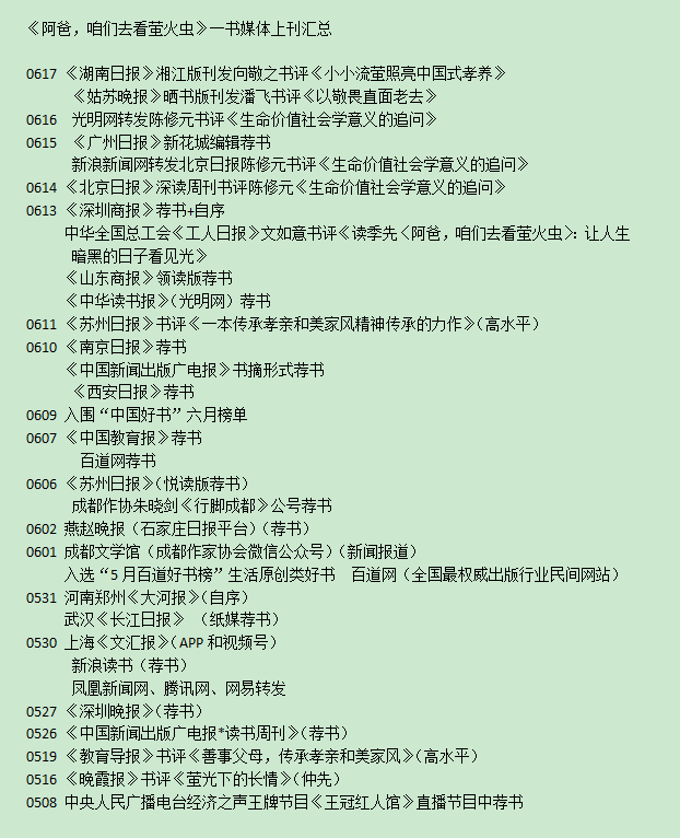 纳博科夫说,任何生命的存在,不过是一条光缝,稍纵即逝,前后皆是永恒的黑暗。以虫喻人,萤火虫最长活不过七天,在亘古绵长的历史长河里,我们何尝不是一只只从生涯跨到死境的弱小“萤火虫”呢?我们在所活的最长不过百年的岁月里,朝着希望、梦想……努力发光发热,试图在这世间留下些许痕迹。本书要成为一盏“路灯”,鼓励千千万万个如季先三哥一样的孝子纷纷涌现,既照顾好垂老的父母,也照顾好将老的自己,把中国传统文化中的“孝”的美好和伟大,继续一代传接一代。我们每一个如萤火虫般微小的生命、每一份如萤火虫般温暖的亲情,要汇聚成光,结集于万家灯火和人间烟火中,像雷佳在《人世间》片尾曲中所唱,“平凡的我们,撑起屋檐之下一方烟火,不管人世间多少沧桑变化”,最终成为人间大爱。进而导引更多的人对于生命建立更深意义的解读和尊重,从此敬畏生命、礼赞生命,少时拼搏,老时坦然,活得精彩,死得无憾!
