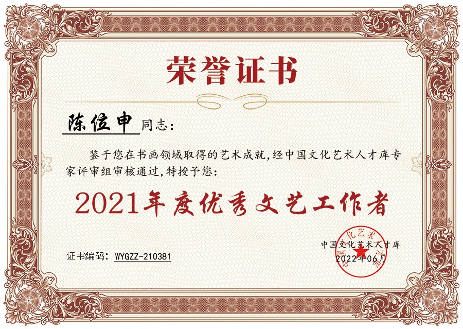 鉴于陈位申同志在书画领域取得的优异成就,经中国文化艺术人才库专家评审组审核通过,授予其“2021年度优秀文艺工作者”荣誉称号。