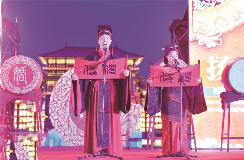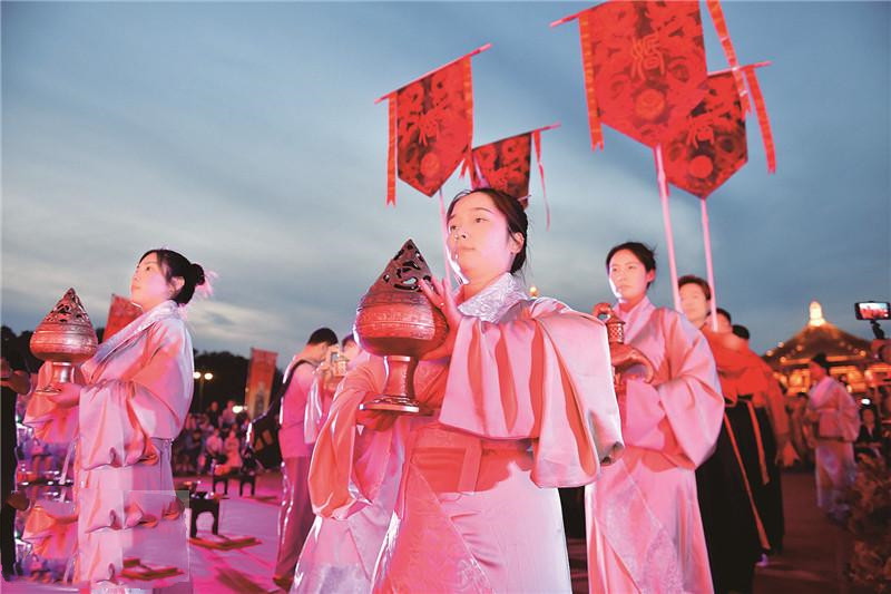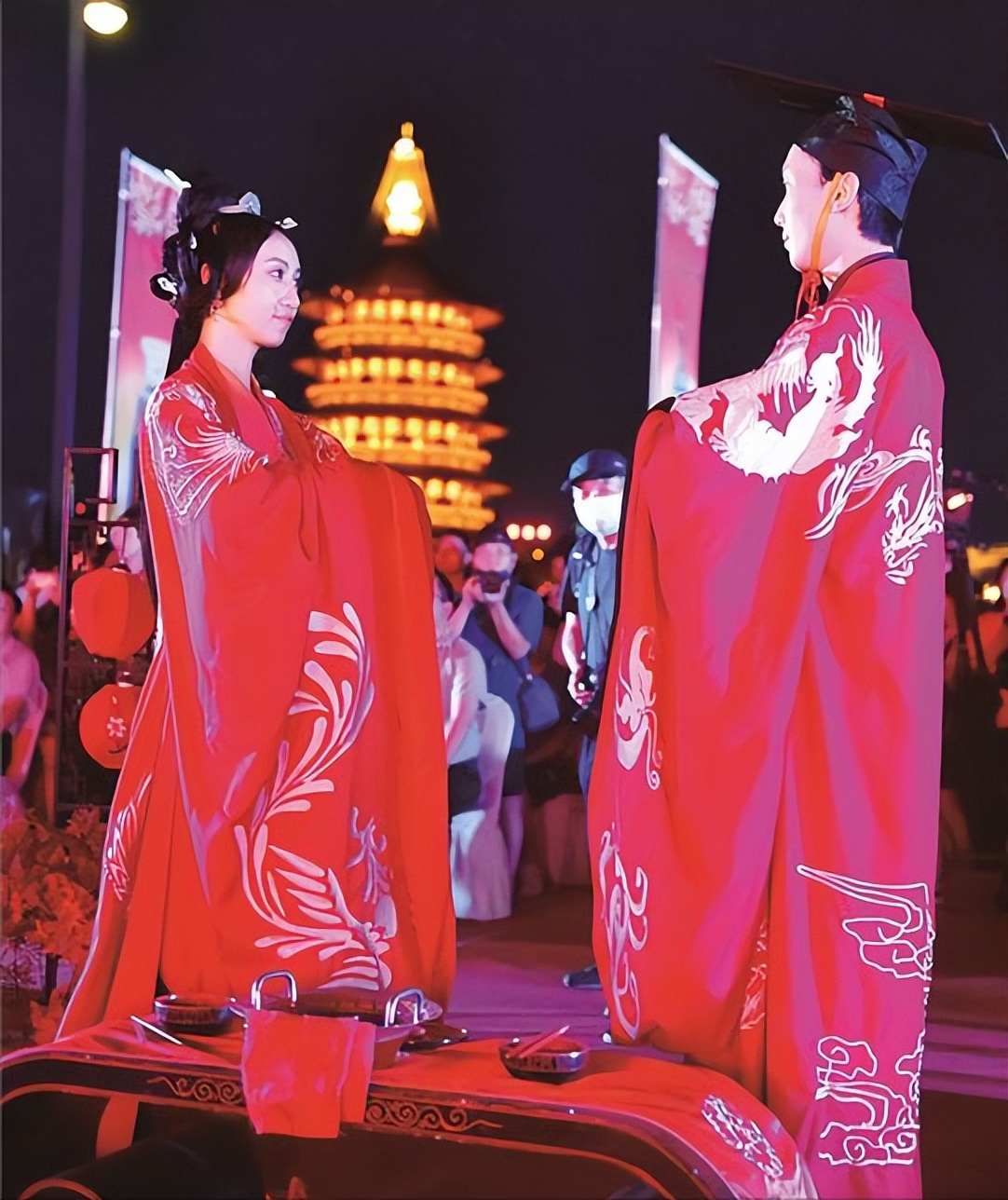 25日晚,洛阳第三届汉文化节暨“汉酱杯”大型汉式集体婚典在应天门北广场成功举办,30对新人免费体验汉式婚典。