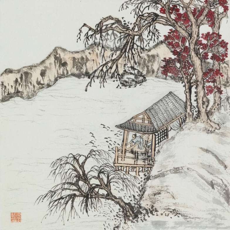 作品讲述:此画为临摹沈周的《东庄图册》之一作品,是一幅浅绛山水画。此画体现出主人公赏景、赏花、赏鱼的休闲生活,表达了对逍遥自适生活的憧憬。