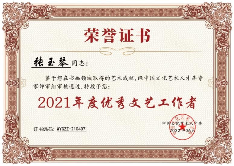 鉴于张玉琴女士在书画领域取得的优异成就,经中国文化艺术人才库专家评审组审核通过,授予其“2021年度优秀文艺工作者”荣誉称号。