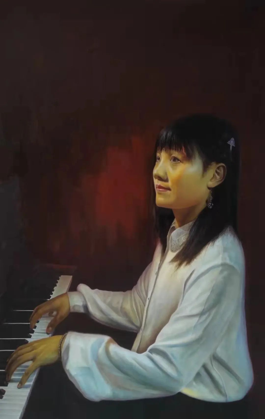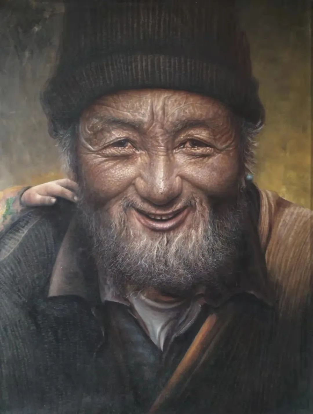 生活里的真善美,一直是刘宽模油画倾心表达的主题!所以他的画有正气,有正能量,有引涉人心向善向美的力量!一幅《老人》肖像作品,画出了东方美学里最令人心动的慈祥!这是一幅极具现实主义魅力的作品,很容易让人想起罗中立的《父亲》,从技法上来说是谓伯仲,只是存着的主题的区别。罗中立画《父亲》,被嵌入了一支铅笔,而刘宽模的《老人》作品中,是在老人的肩头上搭了一只孩子的小手,这更具人性的温馨。看这样的人文寓言,会被生命息息传承的温暖融化身心。可以预见,当人们对温情的有越来越多的寻觅之后,刘宽模的这件作品,也可以成为标见时代人文印象的杰作!