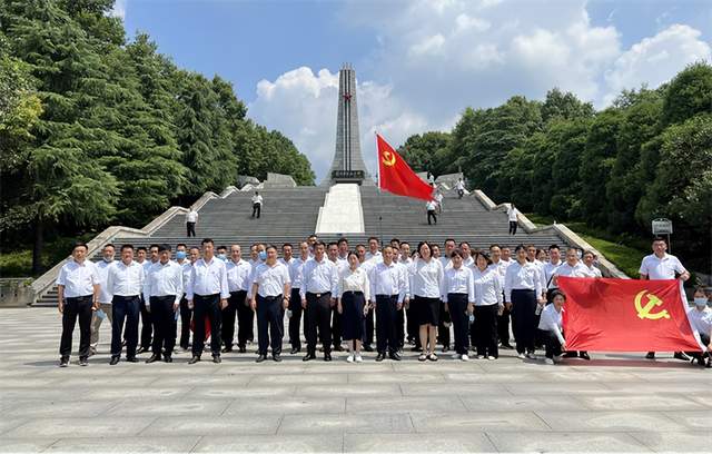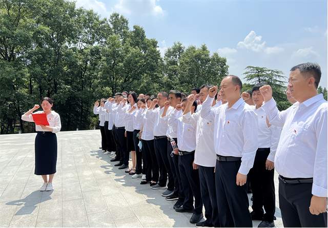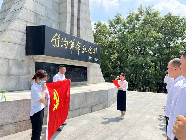 随后,在竹沟革命烈士陵园,大家怀着崇敬的心情,瞻仰了由李先念题词的竹沟革命烈士纪念碑。党委书记赵敏带领全体党员干部,整齐列队,高举右手,面对鲜红的党旗重温入党誓词并庄严宣誓:“我志愿加入中国共产党,拥护党的纲领,遵守党的章程……”,表达了对革命先烈的深切缅怀。