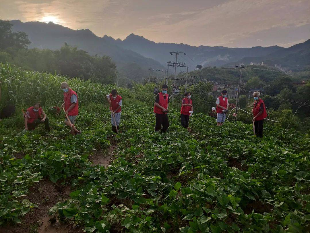 7月13日早上6点半,温德军就和志愿者们出发了,大家上山去给村里孤寡老人、困难老人的2亩红薯山药地锄草施肥,同时也把一家人志愿者在这里栽种的1亩多红薯山药锄草施肥。