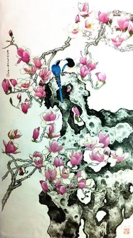 作品讲述:画中,玉堂春灿烂盛开,一对蓝绶带鸟立在太湖寿石上。此画有长寿、和谐、美满之寓意。