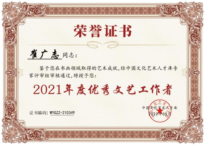 鉴于崔广志先生在书画领域取得的优异成就,经中国文化艺术人才库专家评审组审核通过,授予其“2021年度优秀文艺工作者”荣誉称号。