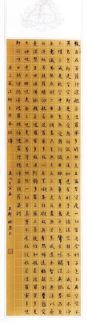 作品讲述:《般若波罗蜜多心经》是由浅入深地全部概括了《大品般若》的义理精要,可谓言简而义丰,词寡而旨深。古来认为读此经可以了解般若经类的基本精神。本经系将内容庞大之般若经浓缩,成为表现‘般若皆空’精神的简洁经典。全经举出五蕴、三科、十二因缘、四谛等法以总述诸法皆空之理。‘色即是空,空即是色’一语,即是出自本经。
