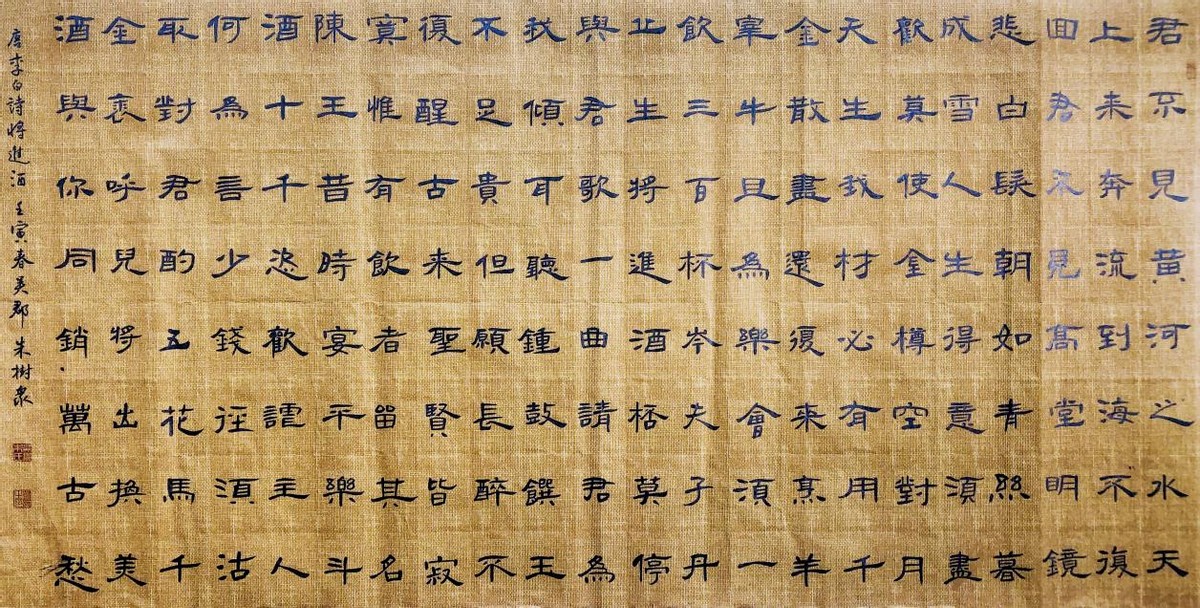 由中国文化艺术人才库组织的第十二期“翰墨传情—书画精英作品在线交易展览”,于7月4日在书画精英在线展览馆一号馆举行。本场展览共有来自于全国各地的11名优秀书画家分别展出了作品,有上万人次的书画爱好者在线观看了展览。本次书画精英作品在线交易展览总计展出30余幅作品,涵盖了书法、篆刻、山水、花鸟、人物等题材,形式多种多样,以传统笔墨牵动书画情缘,促进文化交流与认同,并体现了书画的市场价值。其中书法家朱树众送展的书法作品《六州歌头·桃花》《观世音心经》《将进酒》在本场展览中深受广大书画爱好者及收藏者的喜爱,最终以1200元、1200元、2000元的价格被藏家收藏。