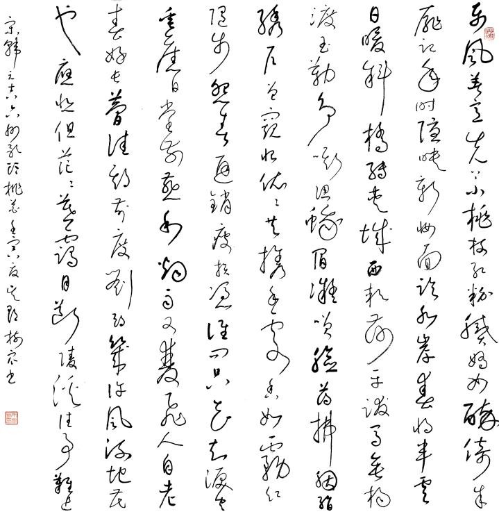此作取法于怀素小草千字文,其字法规范、用笔到位、线条遒劲、粗细有变、运笔流畅、潇洒灵动。字里行间点画滋润、韵味十足,充分体现了线条的质感、厚度和韵味,同时表达了丰富的情感。