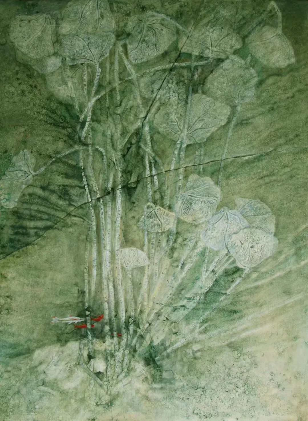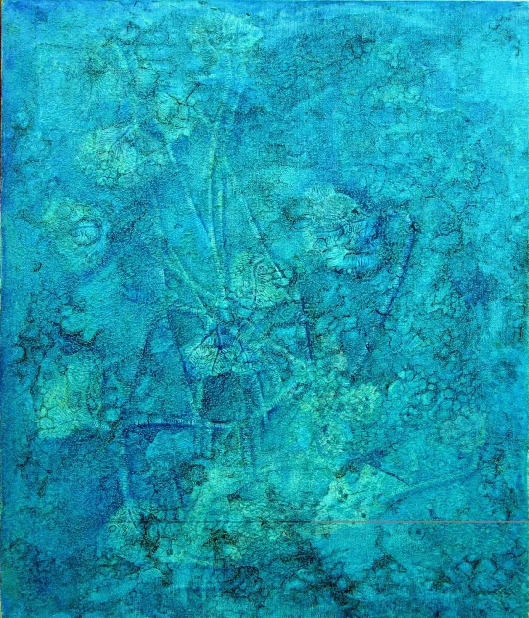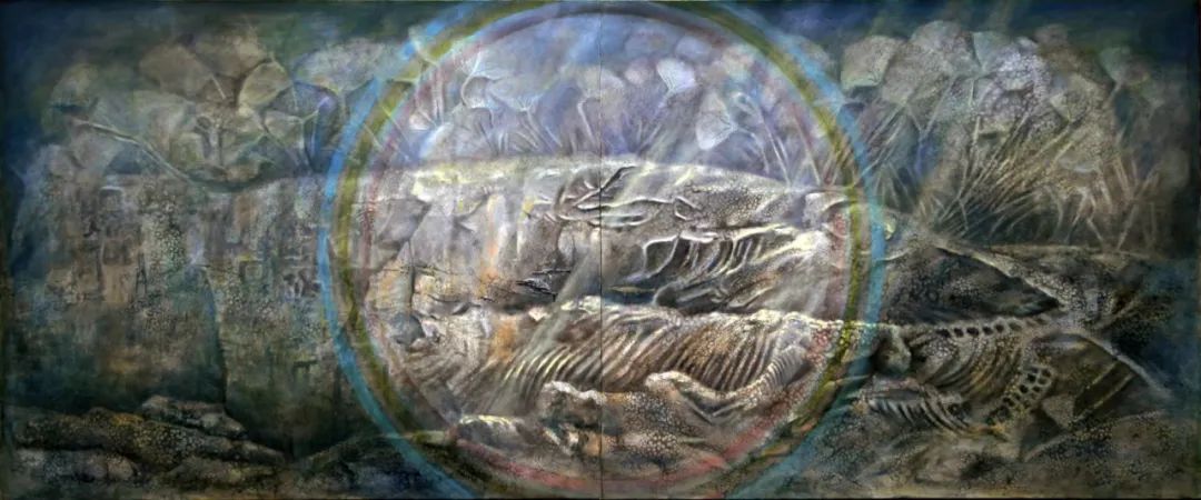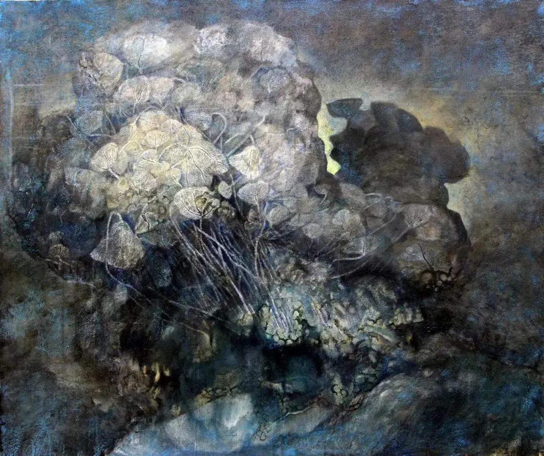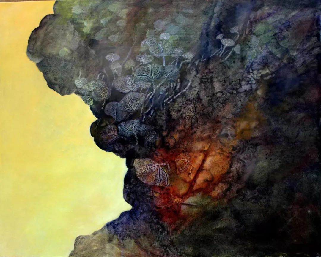 他是海百合的知音,把这种生物的生态进化视为人文内涵的寓言。知之为深,画之为神,把这一独特的物象酝酿成人文画题的独特。一叶一花总关情,流丽朴茂寓哲思,用岩彩画海百合,突出了色彩的质感和动感,极致地渲染出光影下物象的神秘感,光感奇幻,统摄心灵。