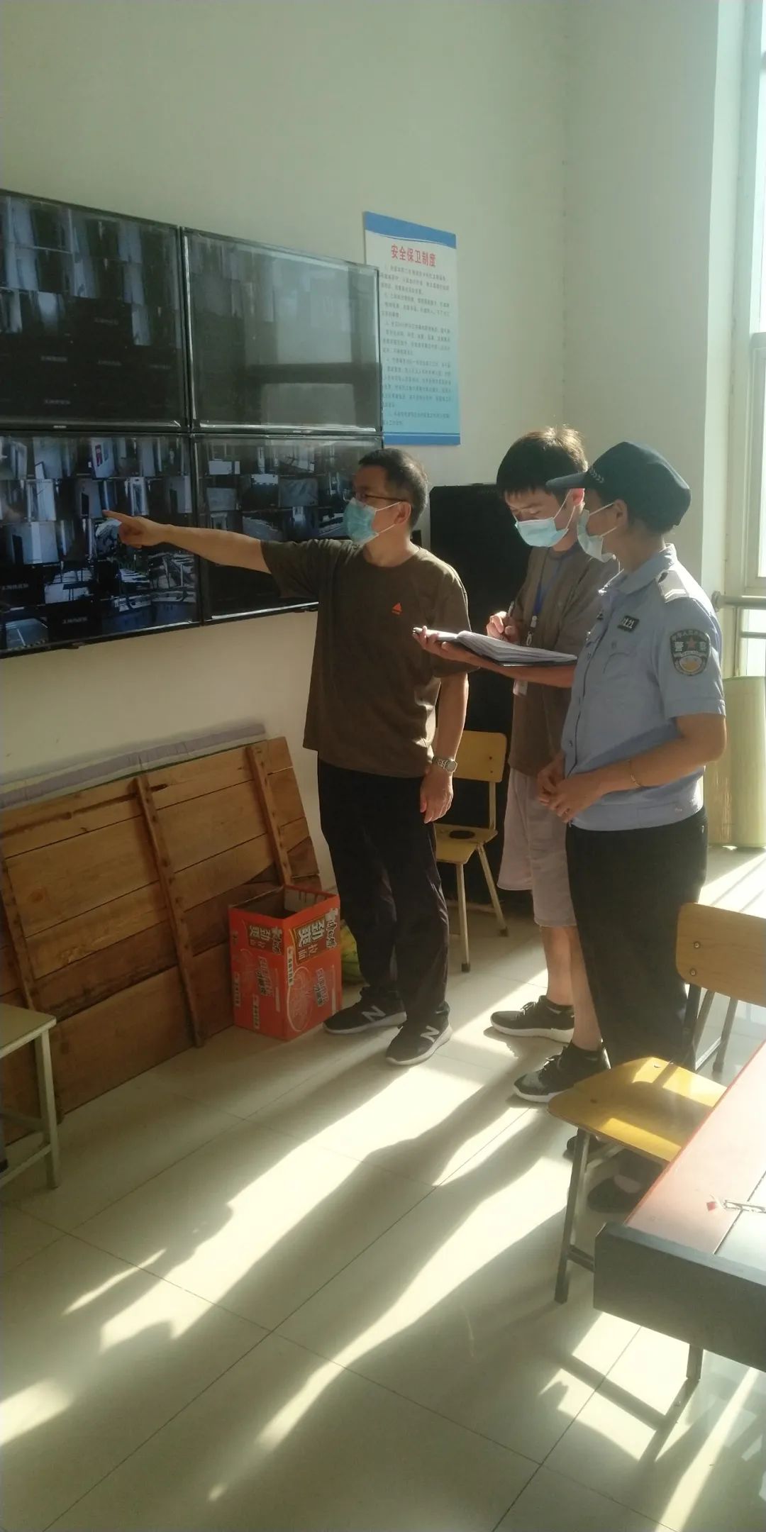 安全保卫组的同志们24小时在岗在位,维护隔离点的正常秩序。在门岗,他们做好出入人员的排查、测温工作;在监控室,他们时刻关注各楼层的动态,发现异常情况及时处置。