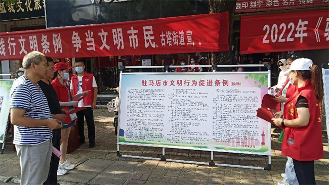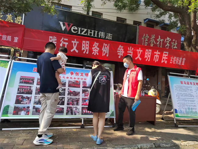 《条例》出台后,古塔街道立即组织机关同志集中学习,要求干部职工在通读条文的基础上,熟知《条例》内容,遵守《条例》、践行《条例》。同时,开展《条例》进家庭、进企业、进乡村、进社区活动。坚持“条例宣传 志愿先行”的原则,成立《条例》宣传志愿服务小分队,在城区主次干道等人流密集区域,开展《条例》宣传活动。活动现场,志愿者通过向市民群众讲解条例内容、设置宣传展板、发放宣传资料等形式,大力宣传《驻马店市文明行为促进条例》,号召广大市民争做文明行为的践行者。