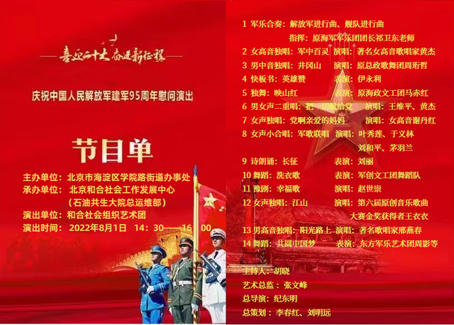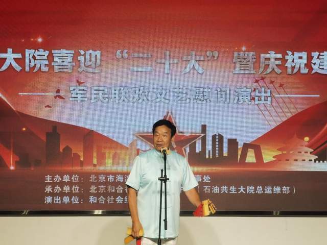 为庆祝中国人民解放军建军95周年、进一步关心关爱属地退役军人的文化文艺生活,为属地烈军属送温暖,8月1日下午,北京市学院路街道办事处、北京和合社会工作发展中心按照政府防控防疫要求,采取线下录制,线上直播的形式,共同举办了《石油共生大院喜迎“二十大”暨庆祝中国人民解放军建军95周年军民联欢文艺慰问演出》。