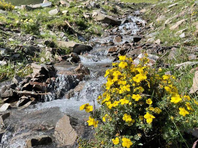 走到尕朵觉悟神山下,迎接你的是潺潺流水,它从尕朵觉悟神山中流出来,流水声好像轻快的音乐一样,带给你一种喜悦和清凉的感受,它好像是为迎接贵宾的奏乐。你沿着小溪一直可以走到神山脚下,小溪两旁的河床都是流石,小溪弯弯曲曲在流石之间奔腾着并发出自然优美的乐章。流石之间有各种黄色的花,尤其是金露梅和高原毛茛,在阳光的照耀下金灿灿地闪烁着,一路上有了流水和鲜花的陪伴,心情很是愉悦。