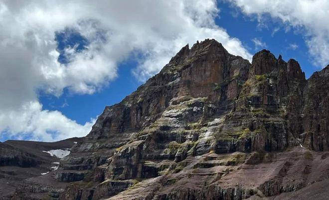 尕朵觉悟神山的主峰,是金字塔状,上面有像阶梯一样的岩层,在蓝天白云的衬托下灰褐色的岩层泛出淡淡的绿色,变化无常的云彩有时会把山头隐在云里,让神山看上更加神秘,这一层层的阶梯好像是通往天堂的路。