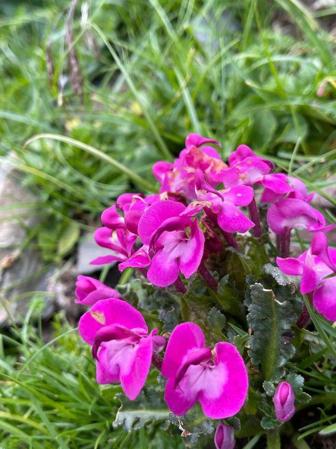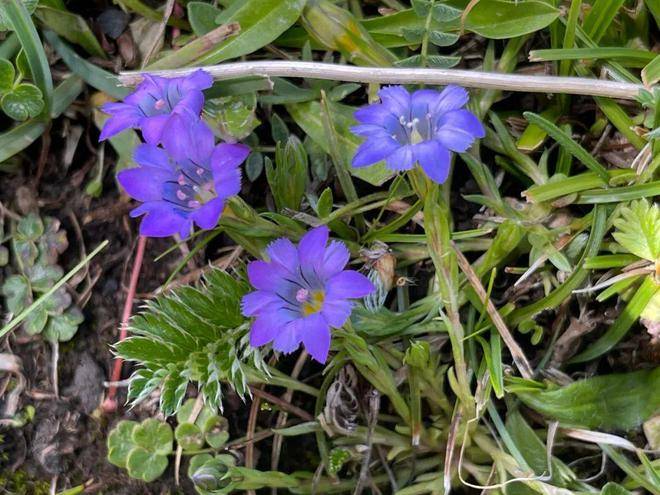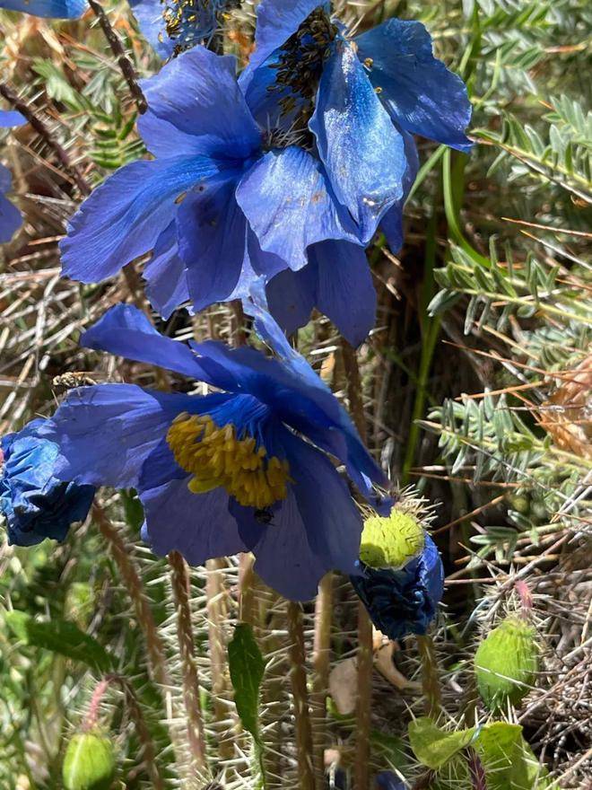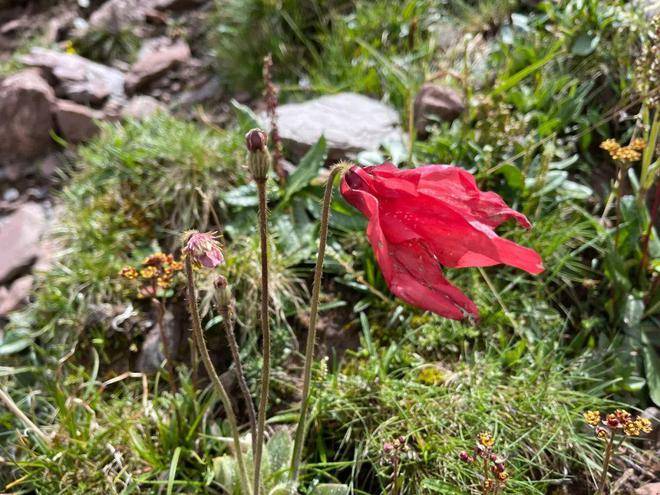 尕朵觉悟神山下有很多红花绿绒蒿,在微风的吹动下好像一面面插在地上的小红旗,在绿色的草地上格外显眼,它们好像在欢迎着我们。我爬到地上认真地看着这颜色鲜艳,动作妩媚的花,花瓣像丝带一样与风一起飞舞。在流石滩中有一些隐身植物,它们的叶子和石头的颜色一样,如果你不仔细观察很难发现它们,这个时候你会发现植物也很聪明,它们想尽一切办法都是为了适应高寒环境来生存。