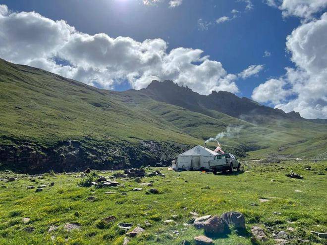 尕朵觉悟神山下有一户牧民在居住,白色的帐篷,黑色的牦牛从远处看去好像洒落在绿色草地上的黑色珍珠。七八月是最好的季节,绿色的草地上开满了各色的小野花,帐篷好像扎在花地毯上一样,你可以充分体会到人与自然和谐的画面,让我们真切体会到一切生命从自然中来,一切生命最终又回归自然的感觉。