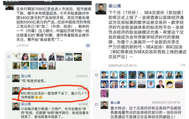 “如今的资本市场发展到现在,已经是脱离了服务实体的初心,成为资本家剥削民众,收割韭菜的工具。”“最可怕的是那些掌握人类大部分财富的资本家,在一个贫富差距越来越大,数字鸿沟越来越大的社会中,借以创新的名义造技术,造出来的技术不过是更大化剥削人民的邪恶工具。”“许多互联网企业为了快速获得用户,在风投的支撑下拼命烧钱,通过掠夺性的低价甚至免费战略,迅速抢占市场,利用自己的垄断地位,挤压和碾压传统行业,这些垄断的恶果最终都将反噬中国经济的发展。”其实在成功打造人设之后,就开始布局收割了,首先用一些经典语录让你相信社会的不公平,只有我可以拯救大家。然后是抛出自己所谓的金融创新观点,让你相信这样的金融创新才能长久的走下去,你跟着我就是赚钱。翟山鹰的“创新”模式是邀请粉丝共同创立公司,粉丝出资几十万、上百万不等,然后翟山鹰再把公司干破产,把钱转到自己兜里。除了常规卖课程之外,翟红鹰持股的普华集团还涉嫌诈骗。据新浪财经报道,受害者爆料称,自2017年开始,普华集团利用培训方式以及网络工具抨击时事及其他社会名人为噱头,自称为政府部门的参事、自然禅门派18代传人、以及社会高端人士等高大上形象,吸引受害群众加入其成立的弟子群,学习国学文化,法人翟红鹰利用受害群众对他的信任,开始宣传,构建商业合作项目,公开许诺投资普华发行的产品二年能获利100倍,投资1年获利10倍,2年能获利100倍。其身家或高达数十亿。据受害者的公开举报信,普华公司员工冒充弟子群学员及其利益绑定者大力鼓吹,诱导受害群众通过各种方式借款筹资疯狂购买普华公司的云盒、虚拟货币sea和预购纽交所上市的APC产品,目前很多受害家庭因房屋抵押,信用卡、各种贷款逾期,妻离子散,生活陷入困境。据悉,翟山鹰利用普华公司搞了一个区块链项目叫普华BSC云盒,外型貌似一个机顶盒。据翟山鹰的描述称,BSC云盒只要插上电就会每天产生一些区块链的SEA虚拟币。而这个SEA虚拟币能在新加坡和纽约的虚拟币交易所进行交易。只要购买了BSC云盒,1到2年就可以通过产生的SEA虚拟币收回成本。以后再产生的SEA虚拟币就是实实在在的真金白银。不过,所谓的“BSC云盒”分红却一拖再拖,许多购买者至今没收到分红,有收到分红的人称钱还不够交电费以及向普华缴纳许可费用的据普华的官网信息显示,“BSC云盒”的售价为4.4万至9.8万元不等。据不完全统计,BSC云盒卖出了十几万个,翟山鹰收益近20亿。据了解,2021年年底,翟山鹰被曝失联,随后被证实举家移民美国。翟山鹰1970年2月6日出生于北京空军大院,1998年至2015年期间先后担任了中国航天科技集团有限公司秘书处秘书、建银国际(控股)有限公司中国分公司总经理、北京东方建投国际教育咨询有限公司总经理、北京商道汇智文化传播中心总经理、北京大学民营经济研究院课题组组长等职务。据悉,翟山鹰家族“根红苗正”,他的爷爷翟良超19岁时就加入了游击队,参加过抗日战争,作为地下党活动多年,曾经为新中国的建立作出过巨大的贡献。父亲翟明战,是建国后的第一批文化人。他先后担任了中国文联出版公司处长、中国戏剧出版社副社长、《中华之魂》编委会主编、北京空军军校正团职参谋等职务。叔叔翟明国 ,先后担任中国科学院地质与地球物理研究所副所长、中国科学院院士、发展中国家科学院院士等职务。