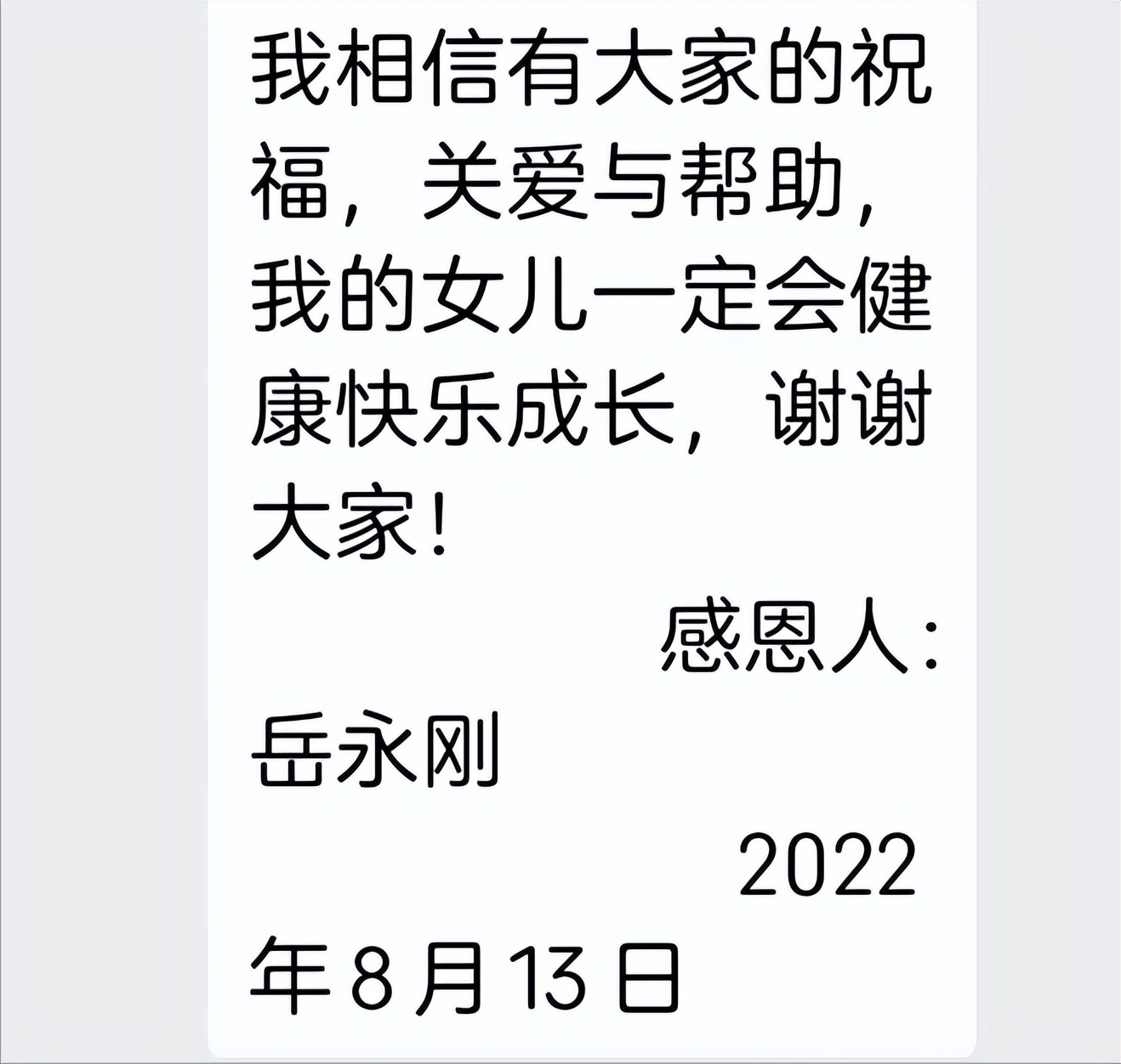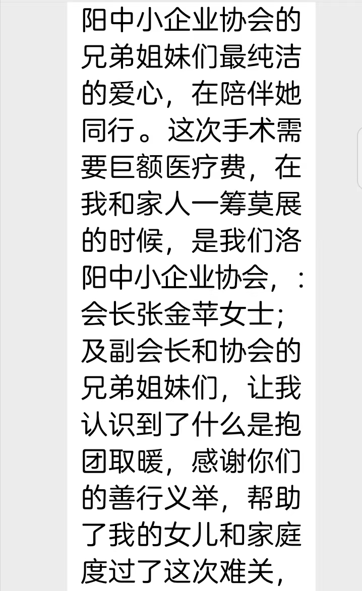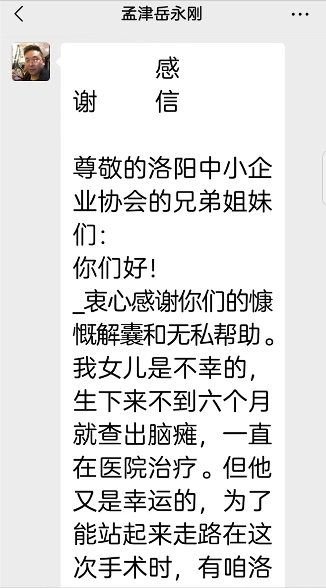 岳永刚得知洛阳中小企业协会家人们为他女儿岳欣怡捐助爱心款时,特别用手机给洛阳中小企业家协会会长张金苹发来一封感 谢 信,他代表全家对洛阳中小企业家协会的所有爱心人士对他女儿的关心和爱心捐助深表感谢。