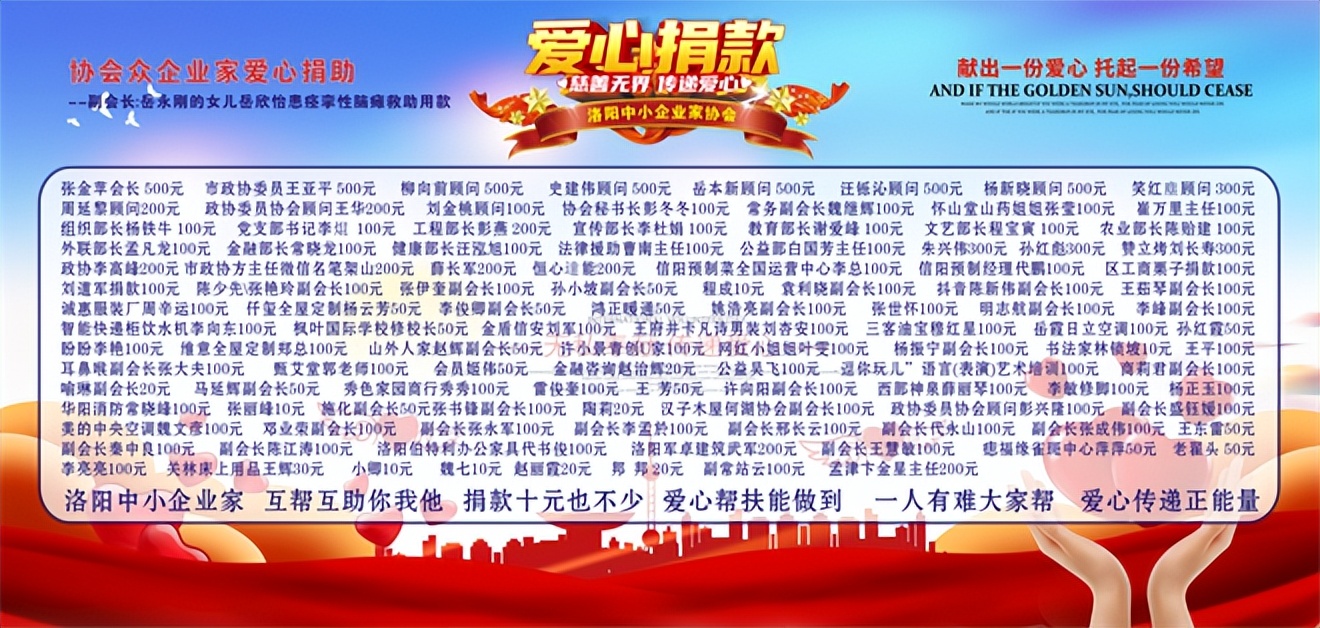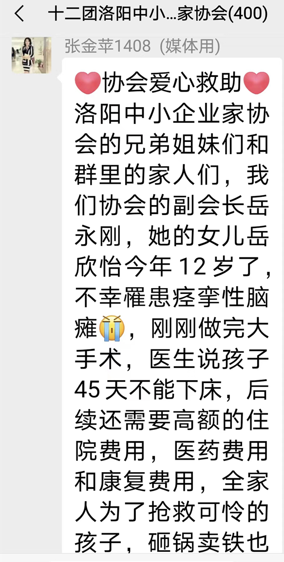 8月13日,在洛阳中小企业家协会这里正在开展一场爱心捐助活动,事情还得从前些天说起,8月7号晚上23时40分左右在洛阳中小企业家协会多个微信里突然收到一条协会发送的爱心救助信息,爱心救助信息内容里这样写道,洛阳中小企业家协会的兄弟姐妹们和群里的家人们,我们协会的副会长岳永刚,他的女儿岳欣怡今年12岁了,不幸患痉挛性脑瘫,刚刚做完大手术,医生说孩子45天不能下床,后续还需要高额的住院费用,医药费用和康复费用,全家人为了抢救可怜的孩子,砸锅卖铁也付不起高额的医疗费用,现求助协会各位企业家兄弟姐妹们伸出温暖的手救救孩子。让我们人人都献出一点爱,救救可怜的孩子。多少不限,十元二十元都可以,多少都是爱。收款人:张莹13837913457