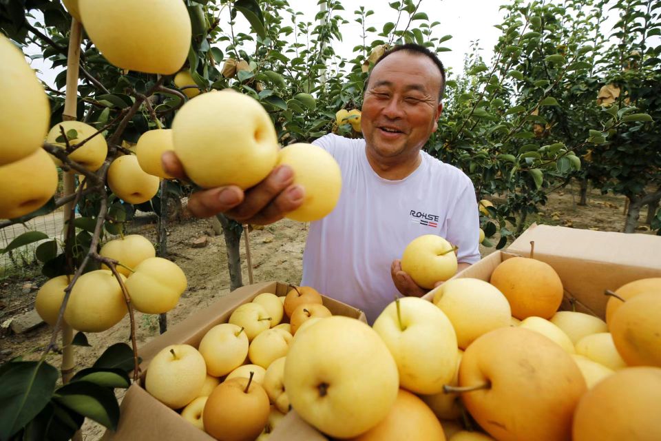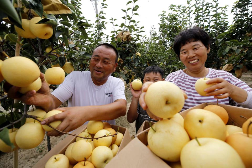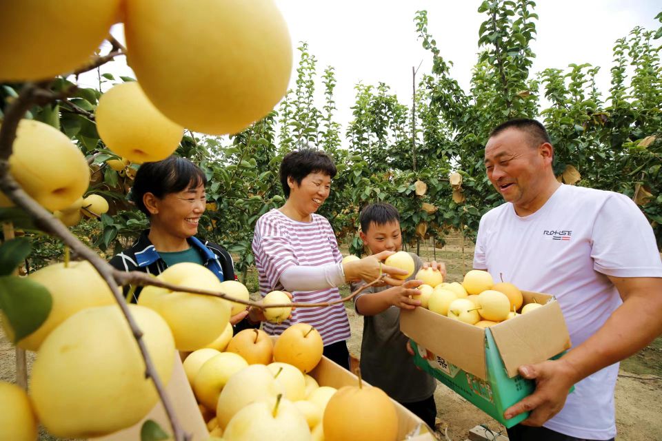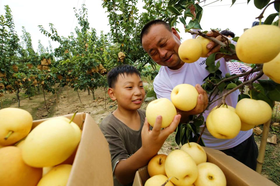 金秋时节,硕果飘香。8月16日,在驻马店市驿城区胡庙乡龙泉村旺丰种植农民专业合作社种植园,黄澄澄的秋梨挂满枝头,很是诱人,园内随处可见忙碌的人们正在采摘喜悦的果实。