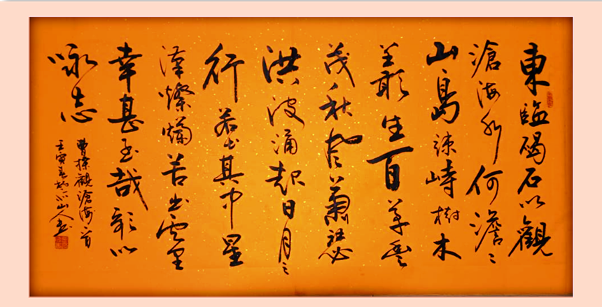 金焕海,字号:楚北山人,1970年出生,湖北省随州市长岗镇大洪山风景名胜区人,中国书画协会会员、江苏省书法家协会会员,中国新时代集邮榜样人物,美术百科入选人物,中国传统文化进万家艺术联合会会员。今天我们介绍的艺术家,他自幼酷爱油画,水粉画,国画,硬笔,后期潜心研习书法,临尽历代古今碑帖,吸取精华三十余载、临池不辍,楷书临习欧、赵、行草取意米蒂、二王,聚古今各家所长,自成一体。书法飘逸洒脱,豪放大气。其作品曾多次获奖,被各大报刊,邮政征用。许多作品被社会及海内外各界人士、收藏家、企业家,博物馆等收藏!