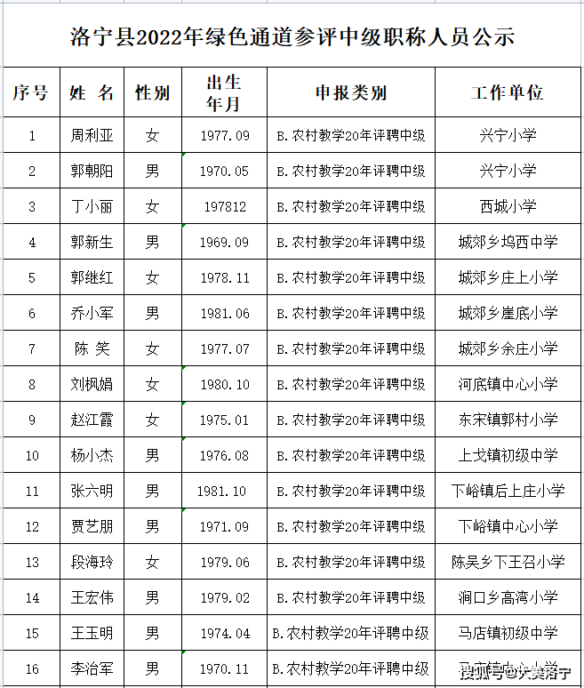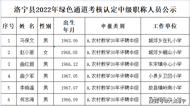 根据河南省人力资源和社会保障厅《关于进一步做好基层专业技术人员职称工作的通知》精神,现对2022年度洛宁县符合农村一线倾斜政策,在农村学校累计从教20年,不受单位岗位结构比例限制直接评聘中小学一级教师;在农村连续从教满30年且离法定退休年龄不满5年,不受单位岗位结构比例限制考核认定中小学一级教师职称人员进行公示。