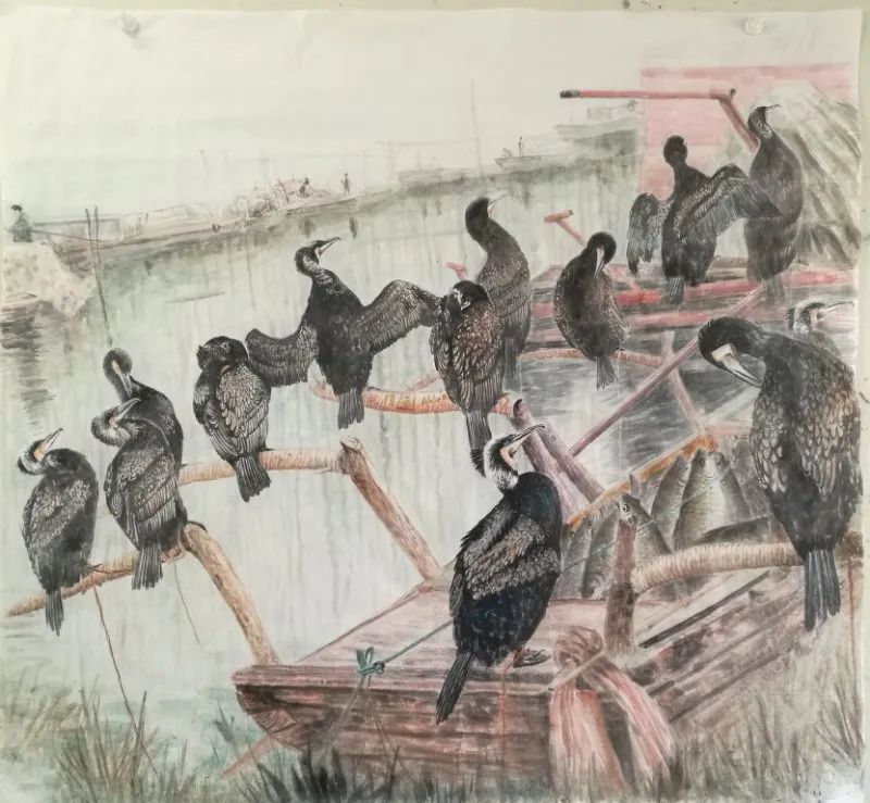 杨士民先生的画法就仿佛是京剧中饮酒一样,没有具体的菜肴盅筷,只那么掩脸后仰做一个姿态就什么都概括其中了,杨先生抓住对象的精神和特征,如鱼鹰长长的颈和喙,三角形的背脊,扁平而坚实的尾羽,还有那炯炯有神的眼珠。着重在构图、姿态、色块以及神情上的内在刻画。鱼鹰一前一后、一仰一俯、一开一合(嚎)均有所区别,加上眸子有趣的点虱,使画面具有了轻快的节奏感。