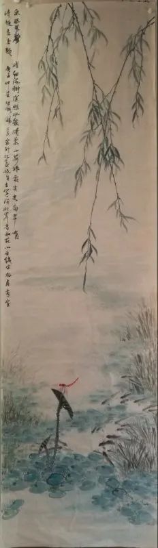 顺着画家的思路,仿佛走进柳条下的荷花园,被柳、荷、芦和蜻蜓、鱼儿等小精灵汇聚的画卷所陶醉,美景交相辉映在眼里。鱼在水中游去又来,蜻蜓在荷园飞来飞去,落在叶子上,与荷相伴,亲密和谐。正如古代诗句“小荷才露尖尖角,早有蜻蜓立上头”,蜻蜓因荷更有灵气!荷叶柳叶鱼儿蜻蜓,画家巧用画笔,通透有立体感。杨士民在创作过程中,心平气和,好像他感觉到了蜻蜓飞来飞去最怕惊动。画出了蜻蜓与荷花的“最佳角度”。总之,作者创作的这幅画,更是他本人的一种感悟,一种乐趣。