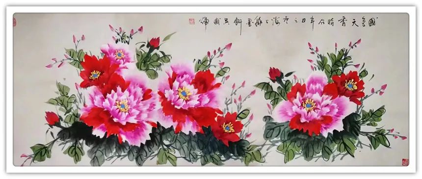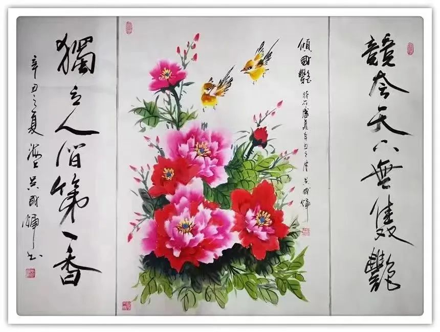 色彩在先生的作品中,亦是有着不可替代的位置。在用色上,先生创造艳丽形象的同时,还充分保持住了中国画的高雅格调,做到了色彩不因艳而显俗,他在北方画派偏用单纯色彩来补充墨色的特点上,加入了岭南派的艳丽色彩,两者进行了有机的结合,可以说是在用色上下足了功夫,在先生的色彩加持下,其花鸟焕然生新,前贤画花,总多以胭脂作花,花青为叶,色泽轻淡,以此显高雅之态,然先生却将其突破,在红中加白,尽显花朵亮丽夺目之势,叶子也掺以墨汁,如此既不失传统,又不失个人特质,从根本上讲,先生的色彩格调,是纯正的,更是独具匠心的。