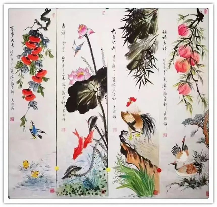 白石大师曾言,画花卉必须有虫鸟陪衬才更生动,纵览先生的花鸟之作,也正是如此,画中先生时常加入鸡禽鸟兽,以此来增添生动之意,而更令人拍案叫绝的,当属先生对牡丹枝干龙飞凤舞的穿插经营,同时这也是他人最难以模仿的地方,其作品无论是清秀荷花,还是春风紫藤,又或金秋瓜果,一一皆是巧用留白,画面简约而意远,整幅构图给人以强烈的精神感悟,处处见性情,更见意韵,众幅作品,花鸟虫禽,小景写真,虚与实,隐与显,动与静相互交织,协调如意,得心应手,暗自天成,画面的情景也因此得到了品质的升华!