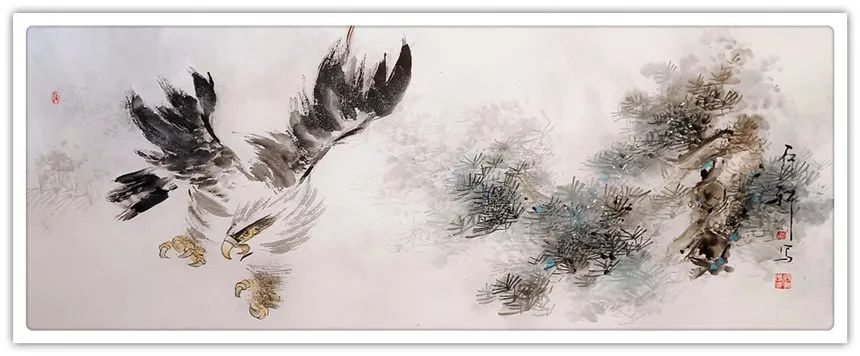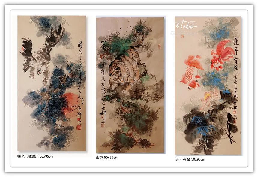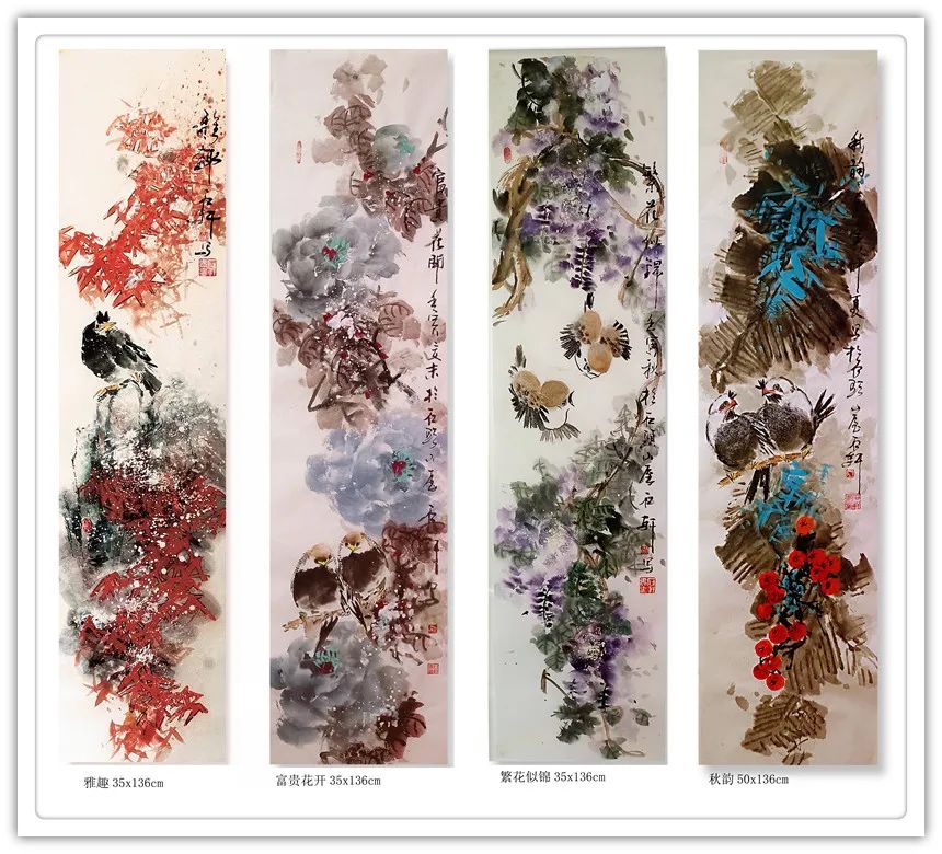 他创作的《果实累累》、《花开富贵》、《暗香浮动》等国画作品,色彩斑斓,布局饱满,给人以清新自然、古朴广博、新颖灵动的感觉。观郭石轩老师的国画作品,不但画的题材宽广,花鸟,动物,山水草木等均有涉猎,并下笔如有神助;而且其画风纯正,心随笔运,神思迭出,不落窠臼,毫无刻板、呆滞之感,整体画面给人干净利落的视觉享受。更进一步说,从画理上,他也摆脱了形的纠缠,已达到形而上的境界。因之,他的画作中,屡见巧拙相参,拙而能巧,时出奇趣,峰回路转之佳品。如《大吉图》、《富贵吉祥》、《锦上添花》、《鹰击长空》、《寿比南山》、《风光不与四季同》等作品,构思奇绝,灵气十足,神韵俱备,令人观之无不心旷神怡。在简练的笔墨、造型、设色中,将一个个动物的神态,一枝枝花草的神韵表现得淋漓尽致,足使雅俗共赏,先睹为快。“画到精神飘没处,已无真相有真魂”,历代书画前贤的艺术理念在郭石轩老师的头脑中已深深扎根,必然使得他洒脱老道的画笔下将呈现出更多更美的优秀作品。