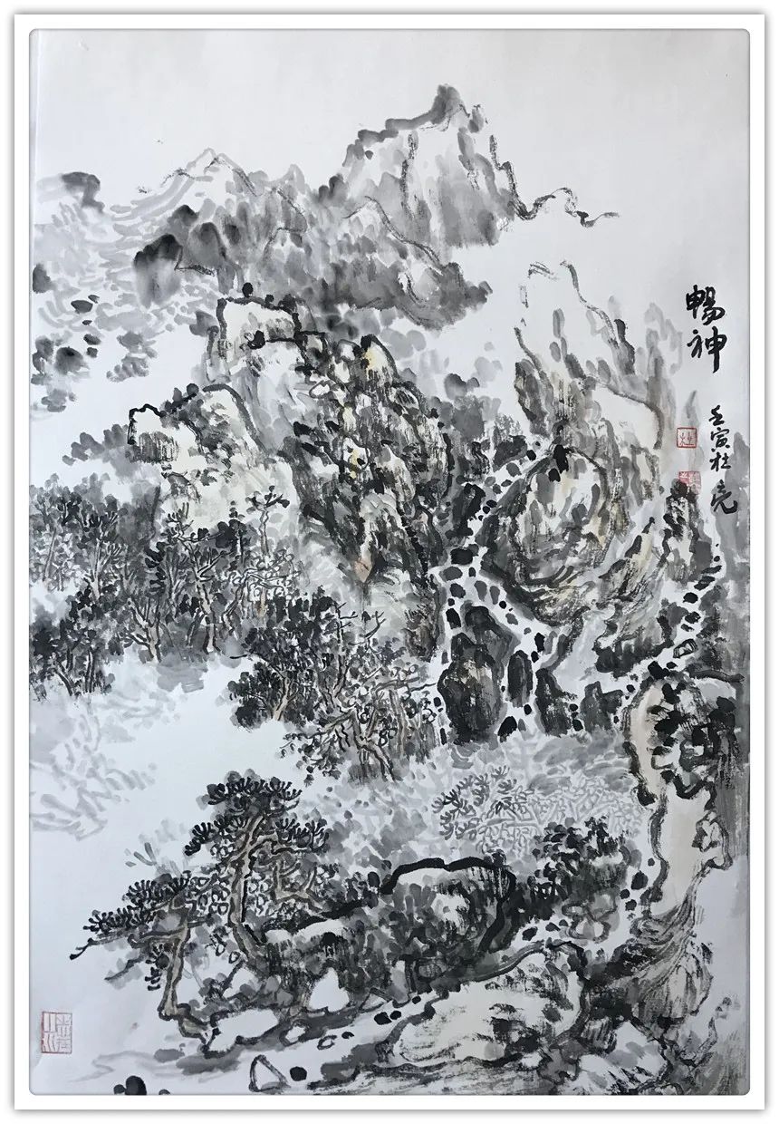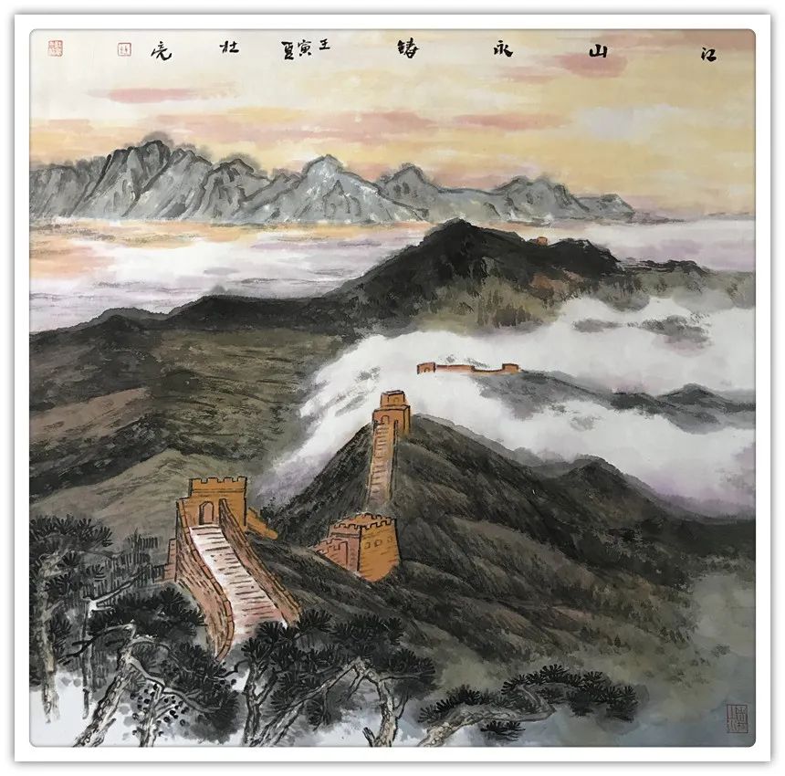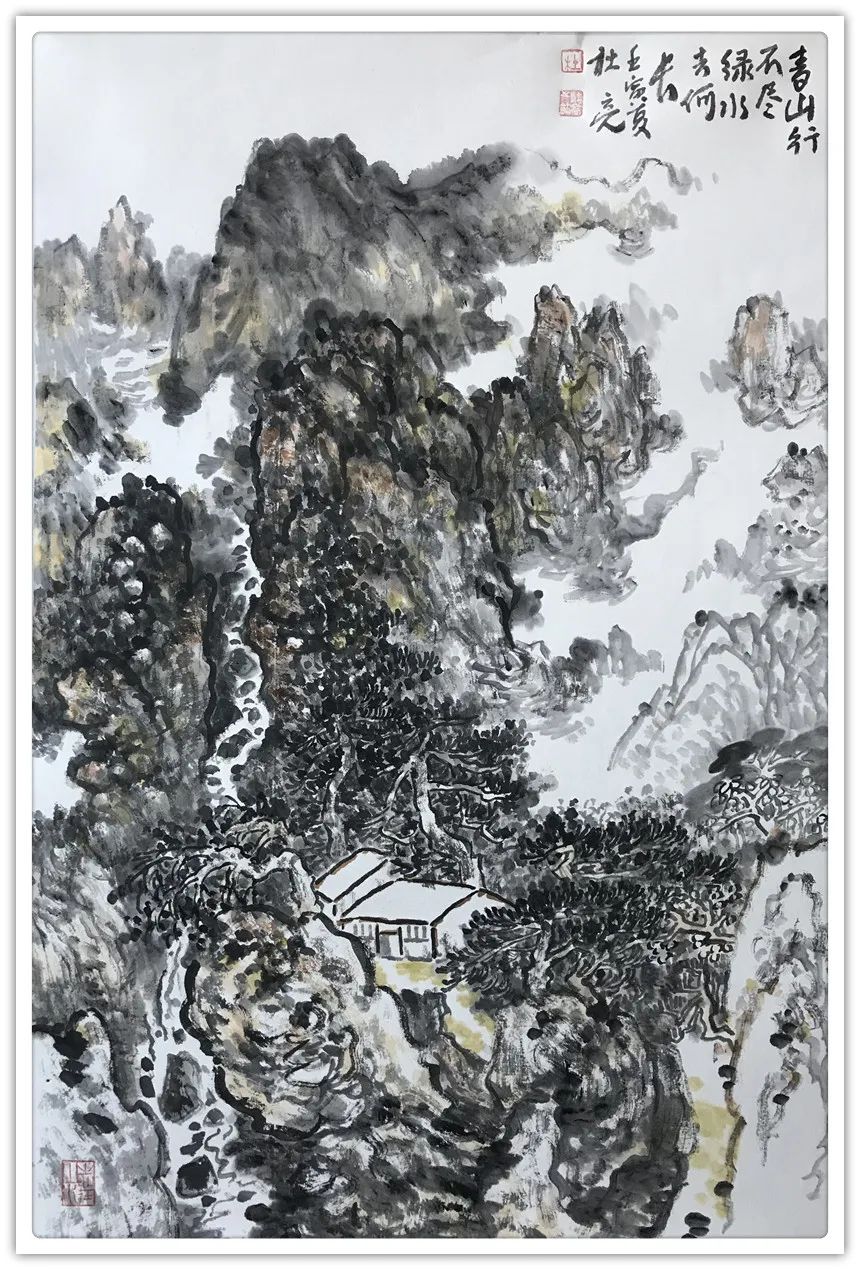 而作为当下画坛中的写意山水名家,杜亮先生显然是深知其创作难度之高,且这一点在他的众幅作品中我们即是能十分清楚的察觉到,其作品初观看似是行云流水的笔墨潇洒,但实则是环环相扣的心境呈现,不仅如此,画中每一处的形意构造,也都是要符合于意象自然,契合于人文审美,倘若笔墨稍有不慎,那整幅作品便就是前功尽弃,付之东流!所以在创作上,先生始终深谙于写意墨法的传统内涵,笔墨之间置于虚无,构型之际呈于深远,并且整幅画面无论是细节的营造还是景致的映带,在杜亮先生的笔下其都是得到了无形的审美契合!咫尺之幅,诚可谓是酣畅淋漓,氤氲而生!