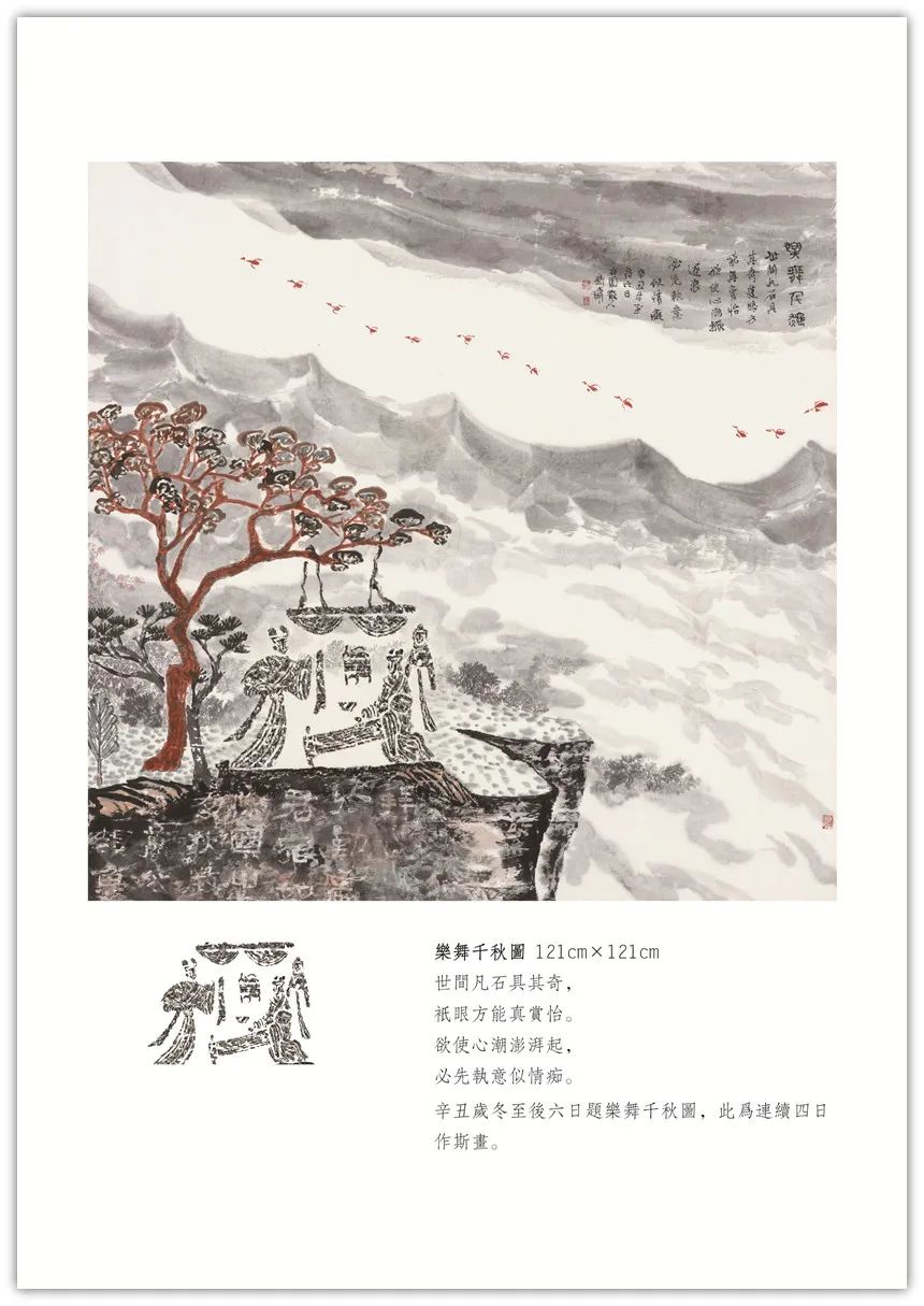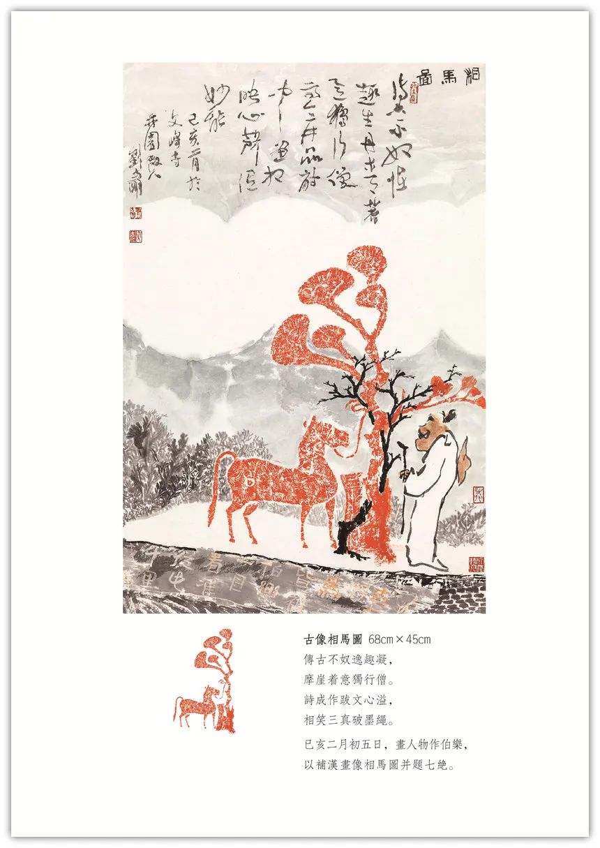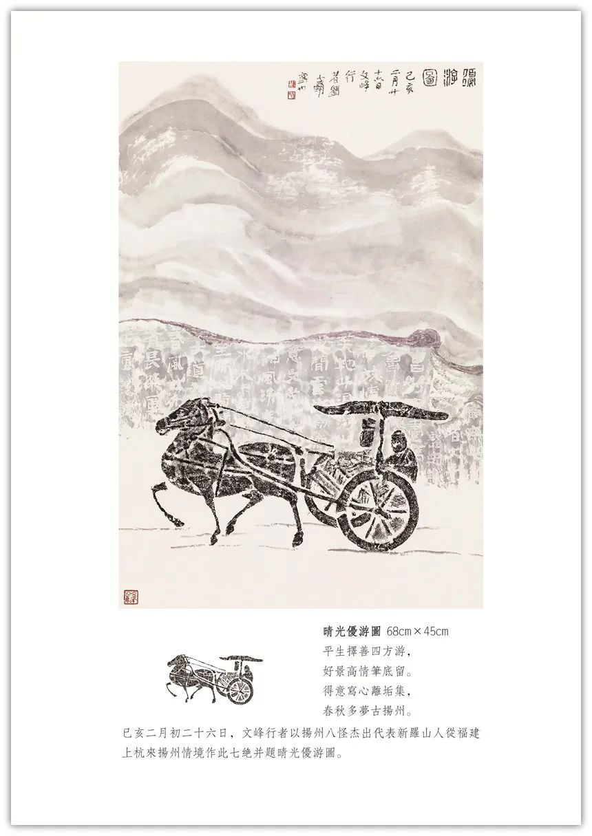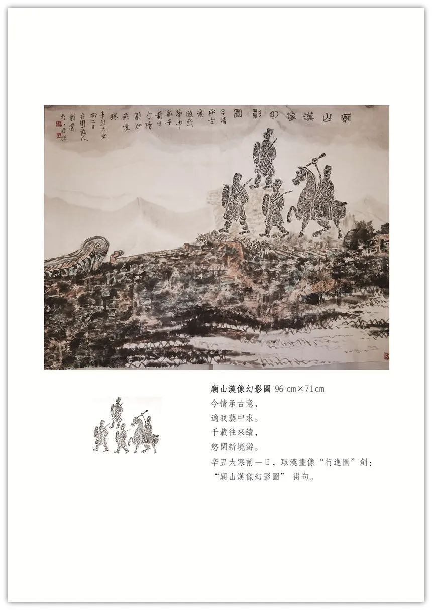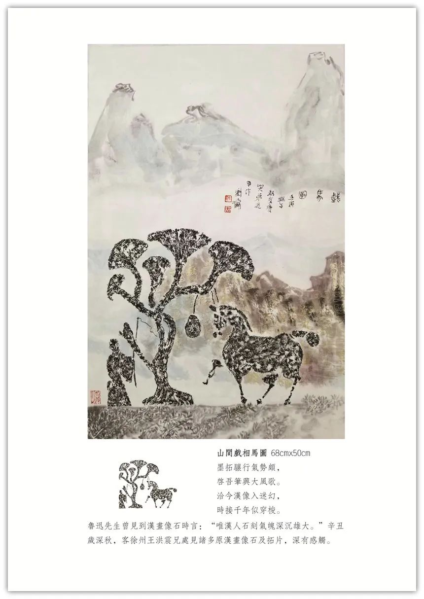 【古像洽今】系列创作始于2018年初。由秦汉以来的画像石、砖拓片(或局部)生发创意,添加上自己的诗书画印元素,旨在穿越一、二千年时空,创作出了独有的学术性、艺术性之作品,把古代文明和现代交化完美的融合在一起,交相辉映。