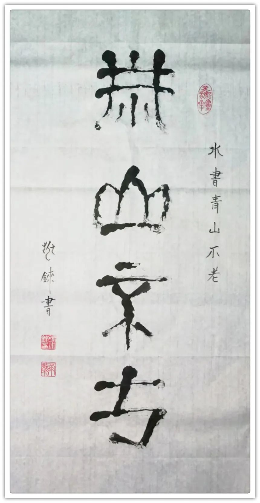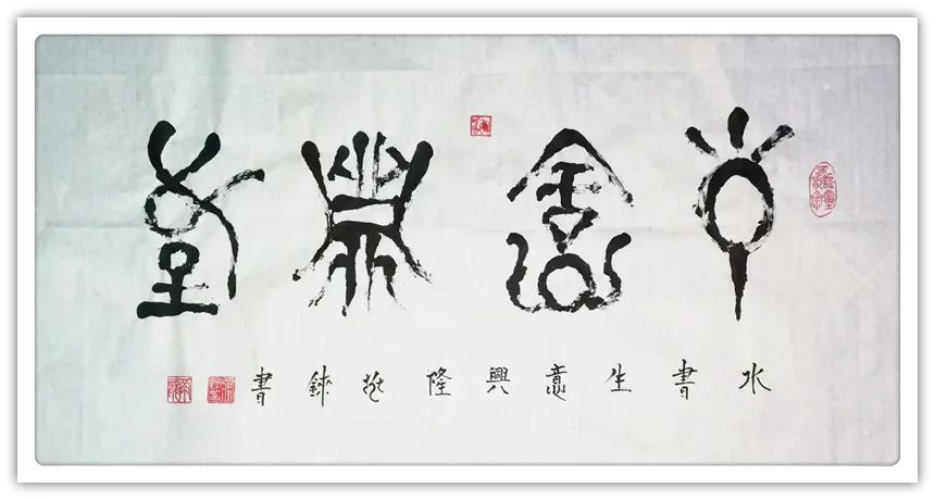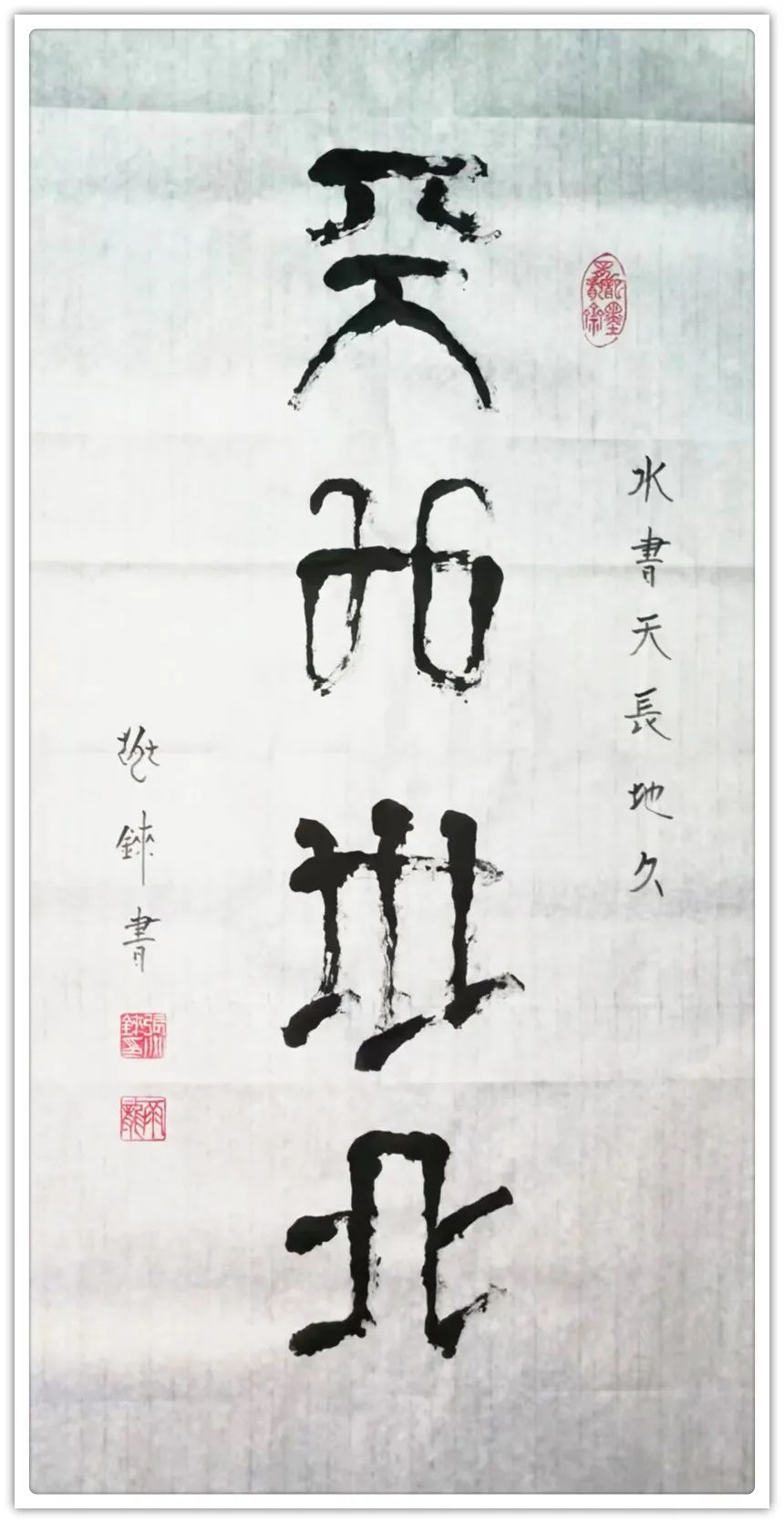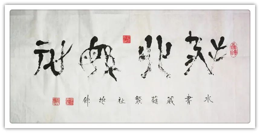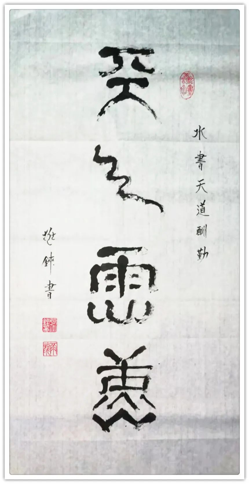 张兆铼先生悟道自然成自性,以自然之美独运笔墨,意匠苦心经营,是张兆铼先生书法的又一特色。张兆铼先生的书法,于无法中求法,于无形中求形,于无笔墨中求笔墨,以口中之气运行于墨色之间,让所书之形于纸上偶然受孕,自生骨肉。这一方面要求书法人的生活基础更广更扎实。另一方面,更需要书法人的灵气,方能催生艺术的精灵。这时,无论积墨还是破墨,皆有厚重感。而且,远景、中景、近景之墨,皆或积或破,或明或暗,或虚或实,或枯或润,让所书对象的灵魂、血肉、神采,灵动于眼前。