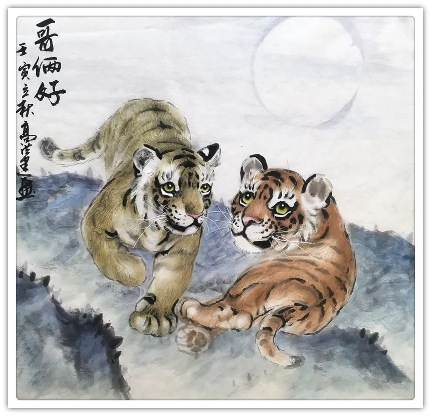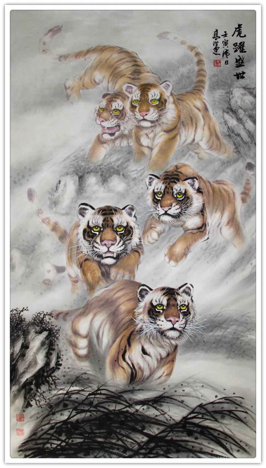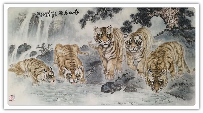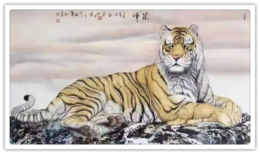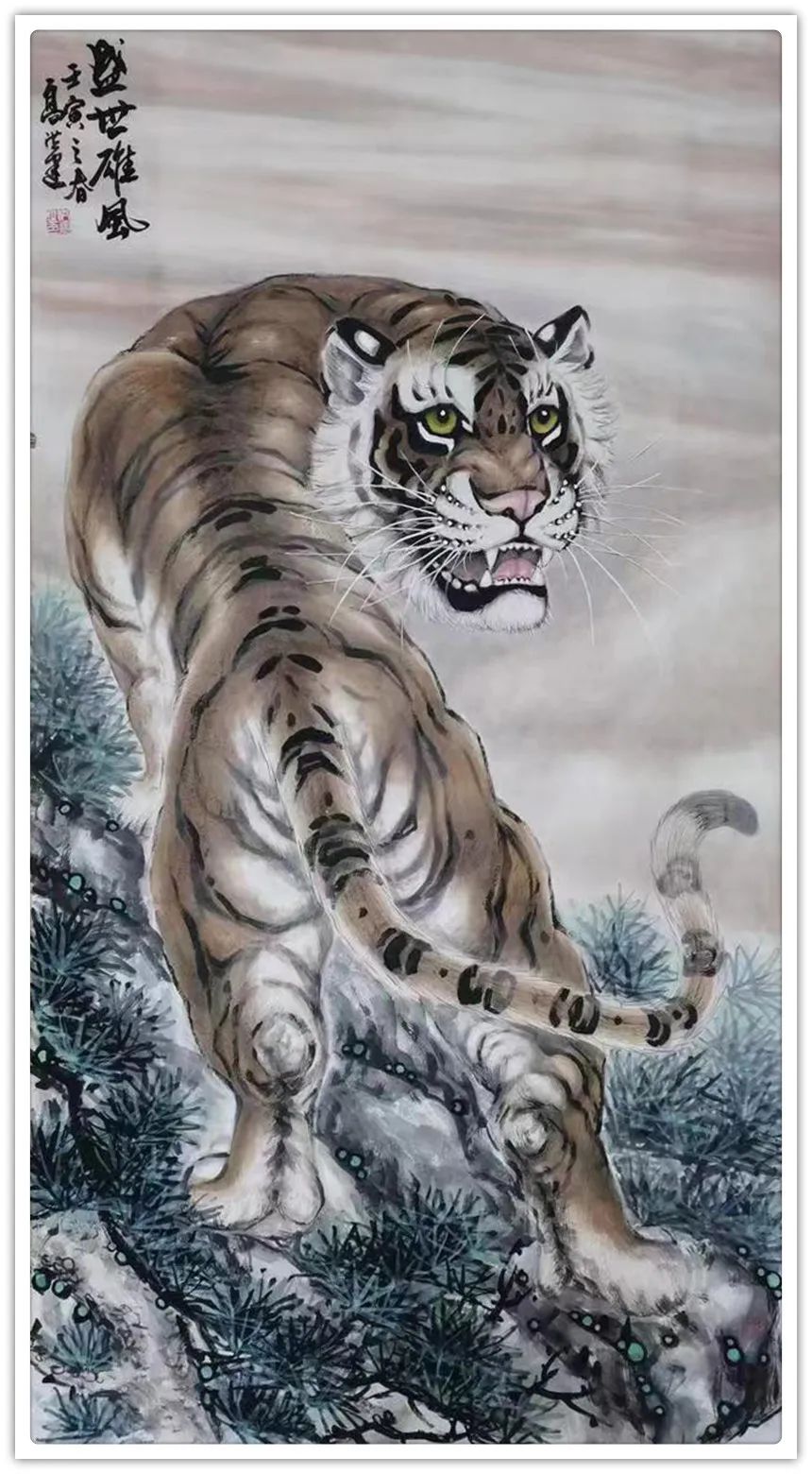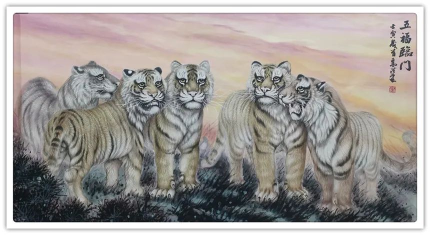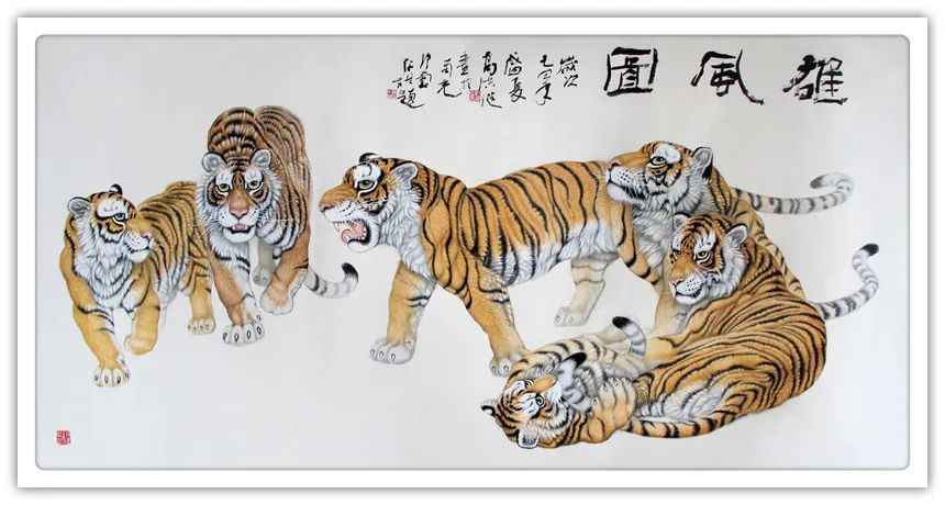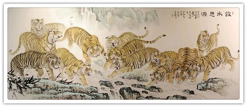 久闻高洪建画虎,很有特色。在省上的一次建国60周年书画展时,展厅里最大的一张八尺工笔国画《群雄图》画着6只形态各异的老虎,虎虎生威,象征着新中国成立以来不断强大的历程,其画艺之精湛,让人振奋。在“纪念辛亥革命100周年书画展”上,高洪建再展雄风,一幅丈二宣整纸的巨幅工笔国画《饮水思源》,画面13只老虎。追逐喜喜,匍匐饮水,栩栩如生,代表13亿中华儿女幸福不忘过去,折服了无数的观众与行家。至此,不少人记住了他的名字;高洪建。高洪建参过军,当过农民、教师、公务员,因为从小酷爱美术,毅然从县级机关领到位置上提前请辞,潜心作画。专攻画虎,令人敬佩有嘉。纵观当今画虎,名家者众,各具特色之极。洪建画虎却与众不同,他广学博取,先博后约。另辟蹊径,他用铅笔素描的笔法,结合老虎皮毛的质感,开创了中锋梳毛法。曾有专家为他定名,一笔画虎技法,我也赞同,因为他的画是用毛笔中锋一笔一画地形成的,应该是他独特的艺术风格。同时在画法上不一味追求工细,把工与写、虚与实结合的恰到好处,颇具特色。不难看出,他的画是有理论依据的,是可以传承和发展的,是有艺术价值和学术价值与市场潜力的。值得一提的是高洪建的儿子高利民毕业于四川美术学院油画系,他画的油画《木船》系列很有思想内涵,从他的画中反映出当代年轻人积极奋进,敢于拼搏的精神面貌,是一个有思想的青年画家,江山代有才人出,洪建父子比翼飞,余以为高洪建在此基础上不断努力探索创新,一定会取得更大的成就。在众多画虎的艺术家群体里,必将以势取雄,劲发出异样而更为美好、生动的巴蜀虎风。