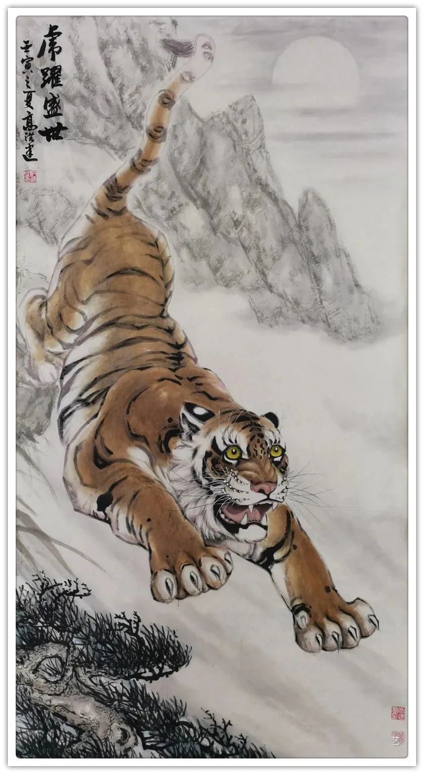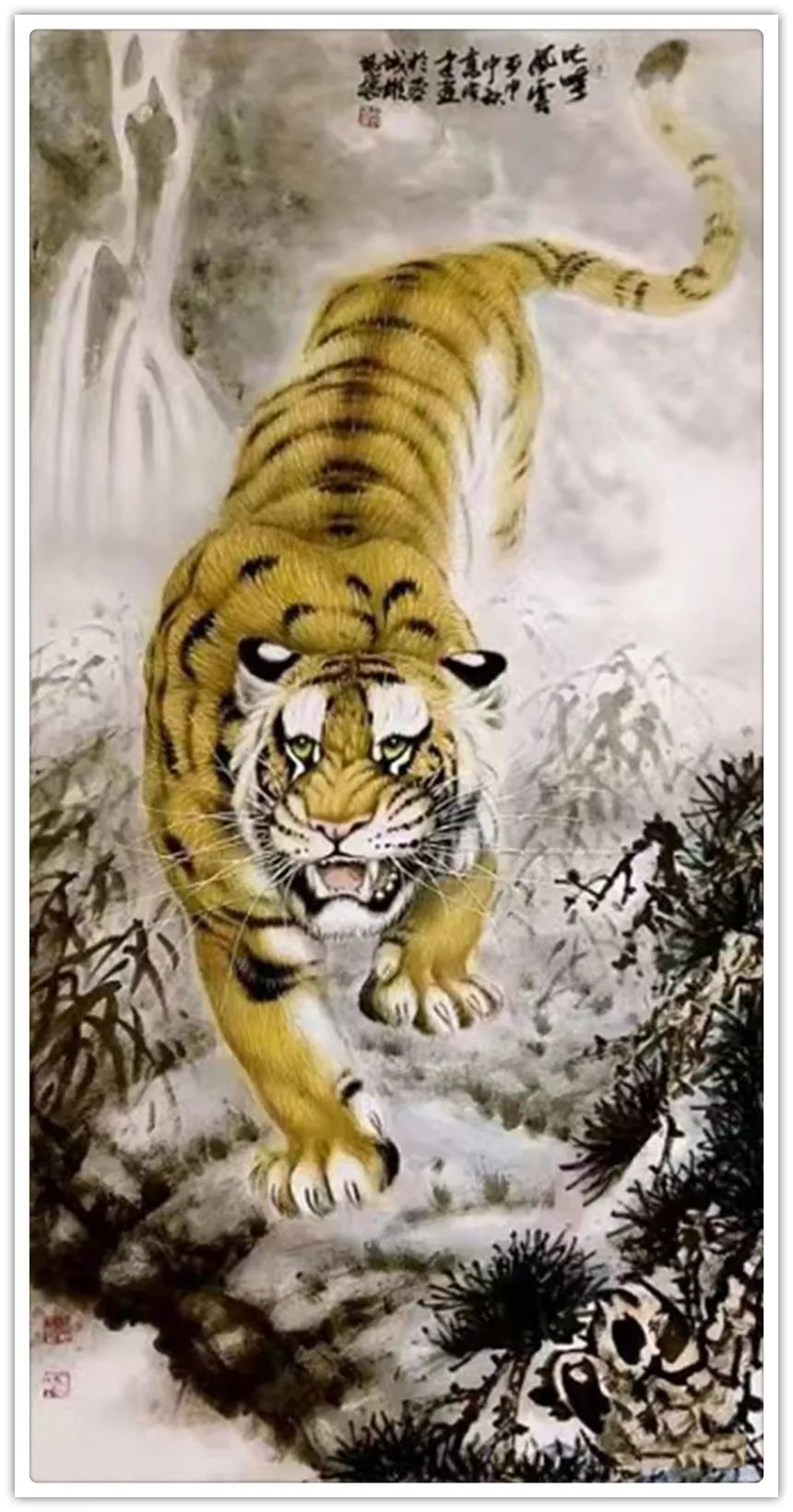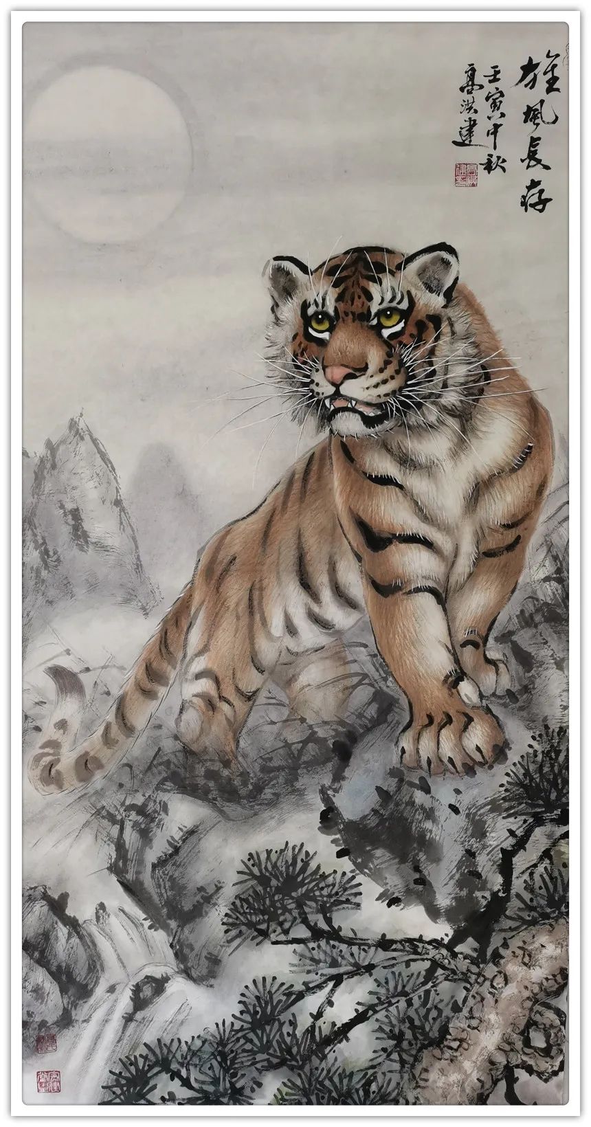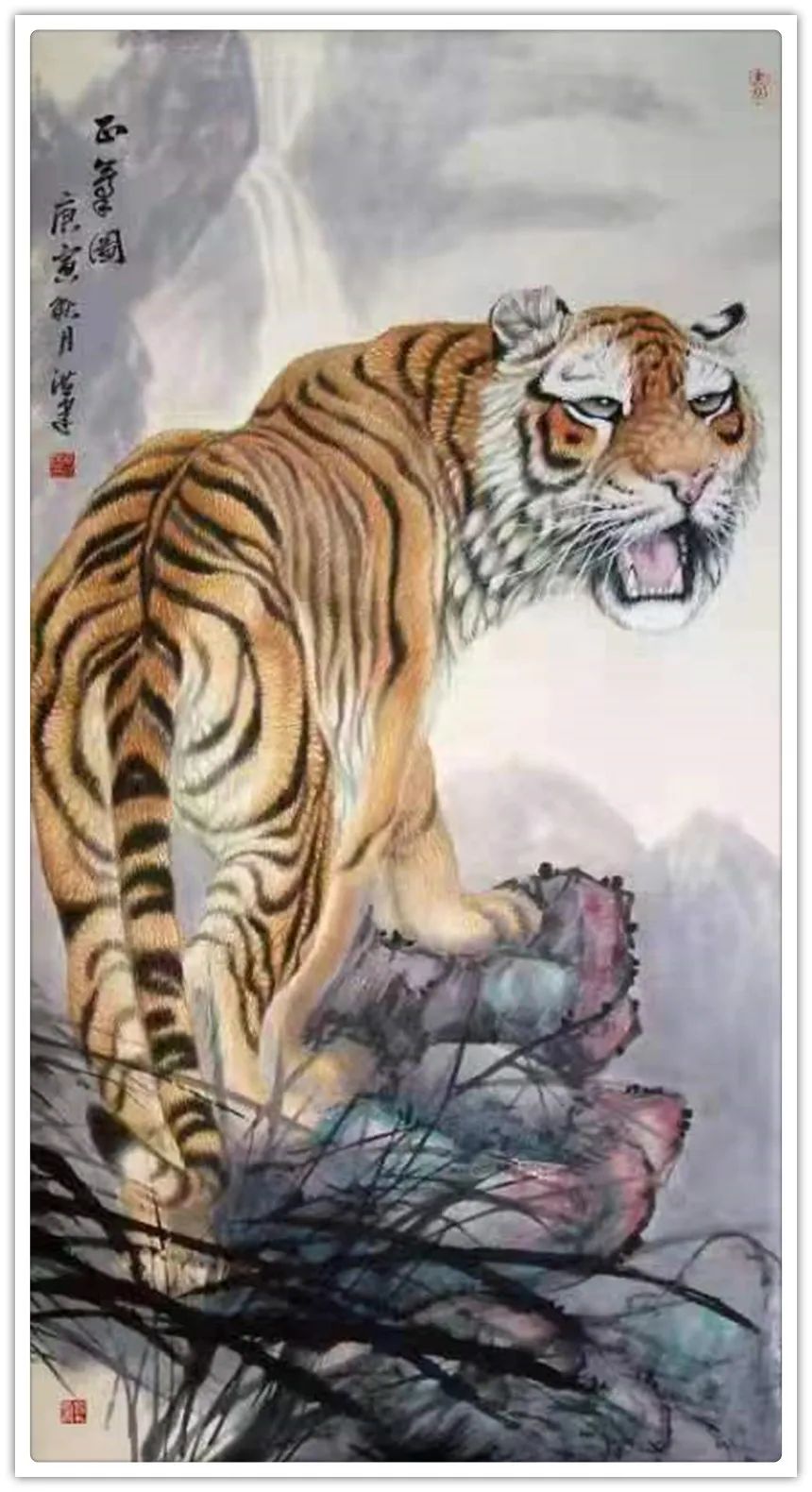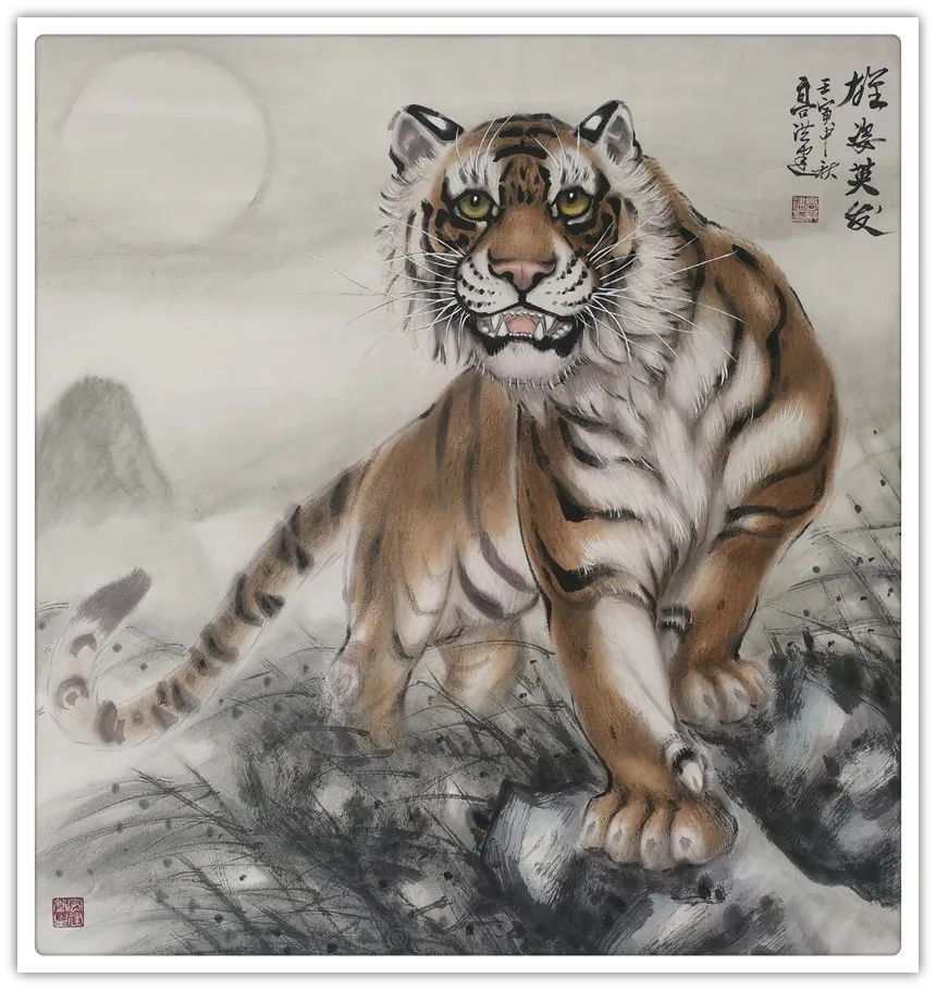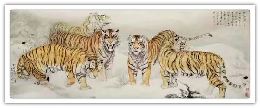 久闻高洪建画虎,很有特色。在省上的一次建国60周年书画展时,展厅里最大的一张八尺工笔国画《群雄图》画着6只形态各异的老虎,虎虎生威,象征着新中国成立以来不断强大的历程,其画艺之精湛,让人振奋。在“纪念辛亥革命100周年书画展”上,高洪建再展雄风,一幅丈二宣整纸的巨幅工笔国画《饮水思源》,画面13只老虎。追逐喜喜,匍匐饮水,栩栩如生,代表13亿中华儿女幸福不忘过去,折服了无数的观众与行家。至此,不少人记住了他的名字;高洪建。高洪建参过军,当过农民、教师、公务员,因为从小酷爱美术,毅然从县级机关领到位置上提前请辞,潜心作画。专攻画虎,令人敬佩有嘉。纵观当今画虎,名家者众,各具特色之极。洪建画虎却与众不同,他广学博取,先博后约。另辟蹊径,他用铅笔素描的笔法,结合老虎皮毛的质感,开创了中锋梳毛法。曾有专家为他定名,一笔画虎技法,我也赞同,因为他的画是用毛笔中锋一笔一画地形成的,应该是他独特的艺术风格。同时在画法上不一味追求工细,把工与写、虚与实结合的恰到好处,颇具特色。不难看出,他的画是有理论依据的,是可以传承和发展的,是有艺术价值和学术价值与市场潜力的。值得一提的是高洪建的儿子高利民毕业于四川美术学院油画系,他画的油画《木船》系列很有思想内涵,从他的画中反映出当代年轻人积极奋进,敢于拼搏的精神面貌,是一个有思想的青年画家,江山代有才人出,洪建父子比翼飞,余以为高洪建在此基础上不断努力探索创新,一定会取得更大的成就。在众多画虎的艺术家群体里,必将以势取雄,劲发出异样而更为美好、生动的巴蜀虎风。