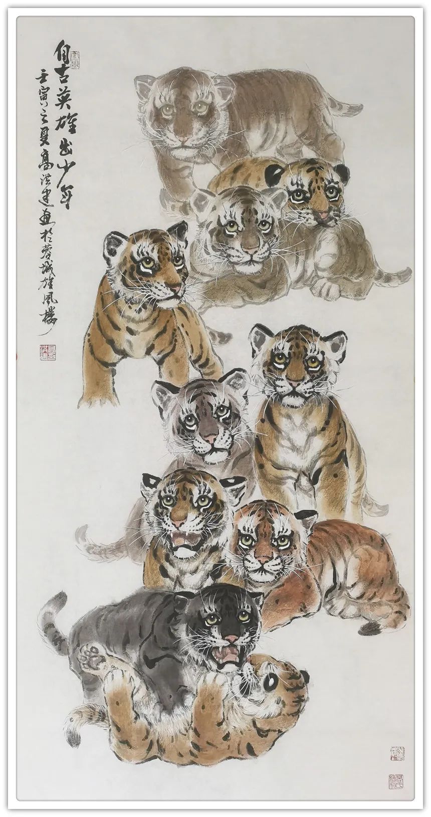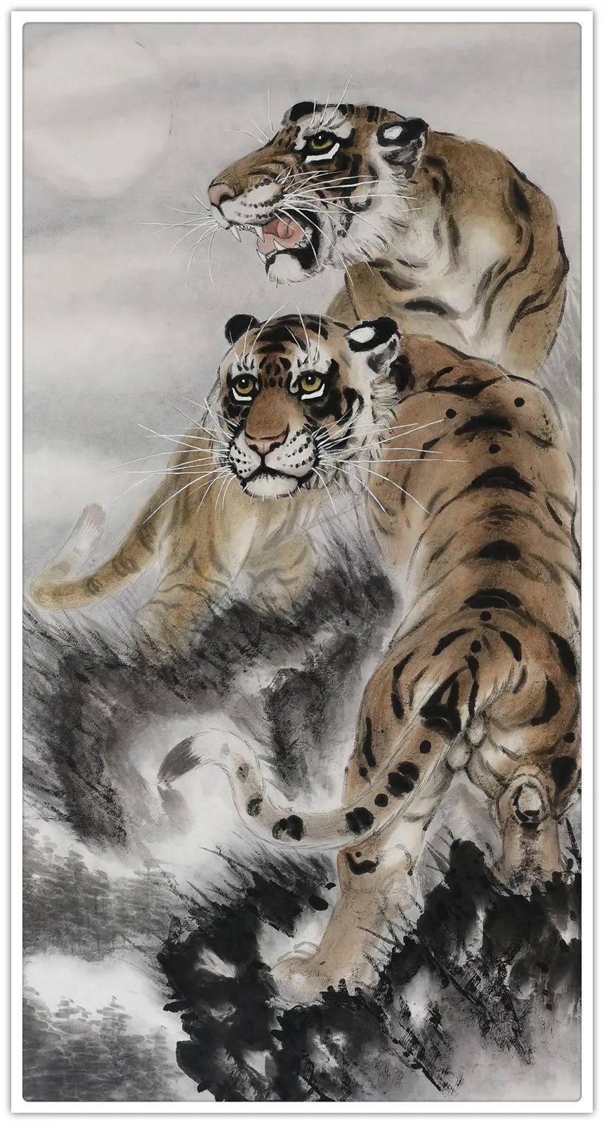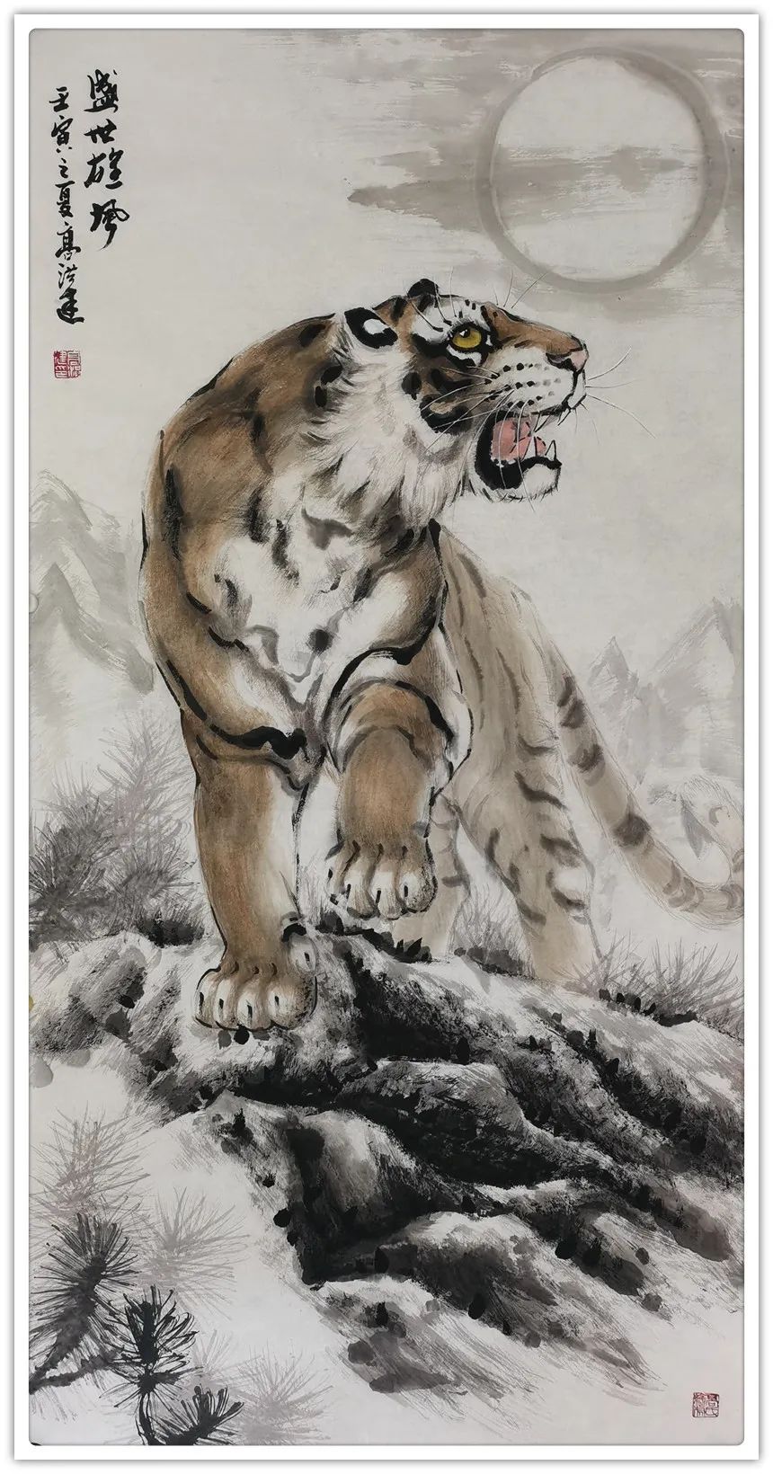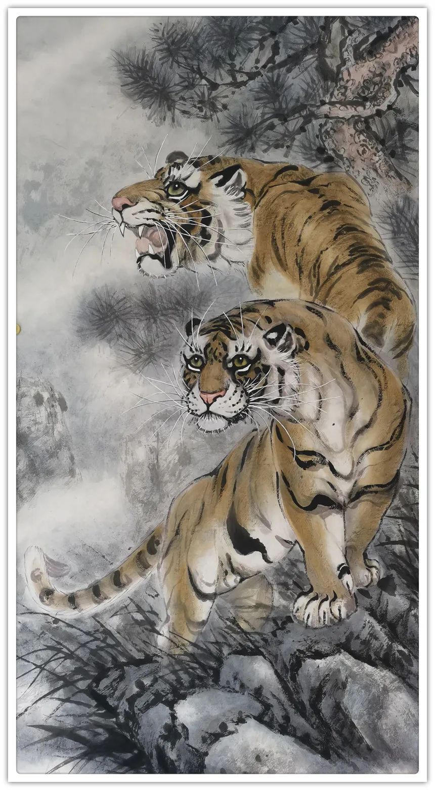 久闻高洪建画虎,很有特色。在省上的一次建国60周年书画展时,展厅里最大的一张八尺工笔国画《群雄图》画着6只形态各异的老虎,虎虎生威,象征着新中国成立以来不断强大的历程,其画艺之精湛,让人振奋。在“纪念辛亥革命100周年书画展”上,高洪建再展雄风,一幅丈二宣整纸的巨幅工笔国画《饮水思源》,画面13只老虎。追逐喜喜,匍匐饮水,栩栩如生,代表13亿中华儿女幸福不忘过去,折服了无数的观众与行家。至此,不少人记住了他的名字;高洪建。高洪建参过军,当过农民、教师、公务员,因为从小酷爱美术,毅然从县级机关领到位置上提前请辞,潜心作画。专攻画虎,令人敬佩有嘉。纵观当今画虎,名家者众,各具特色之极。洪建画虎却与众不同,他广学博取,先博后约。另辟蹊径,他用铅笔素描的笔法,结合老虎皮毛的质感,开创了中锋梳毛法。曾有专家为他定名,一笔画虎技法,我也赞同,因为他的画是用毛笔中锋一笔一画地形成的,应该是他独特的艺术风格。同时在画法上不一味追求工细,把工与写、虚与实结合的恰到好处,颇具特色。不难看出,他的画是有理论依据的,是可以传承和发展的,是有艺术价值和学术价值与市场潜力的。值得一提的是高洪建的儿子高利民毕业于四川美术学院油画系,他画的油画《木船》系列很有思想内涵,从他的画中反映出当代年轻人积极奋进,敢于拼搏的精神面貌,是一个有思想的青年画家,江山代有才人出,洪建父子比翼飞,余以为高洪建在此基础上不断努力探索创新,一定会取得更大的成就。在众多画虎的艺术家群体里,必将以势取雄,劲发出异样而更为美好、生动的巴蜀虎风。