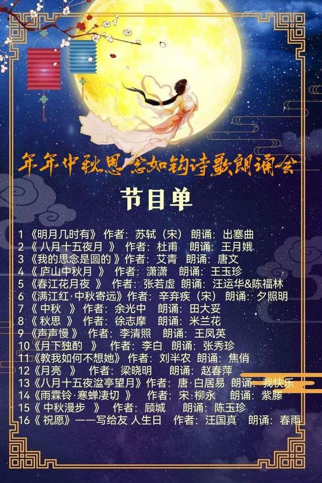 我是本场《年年中秋思念如沟》诗会总导演王凤英。首先感谢詩友们准时聆听《年年中秋思念如钩》诗歌朗诵会,您的到来,使我们的诗会蓬荜生辉。祝您和家人身体健康,中秋节快乐!