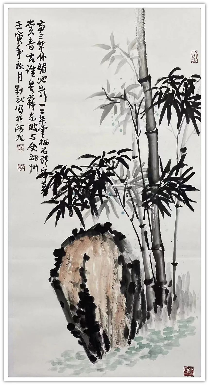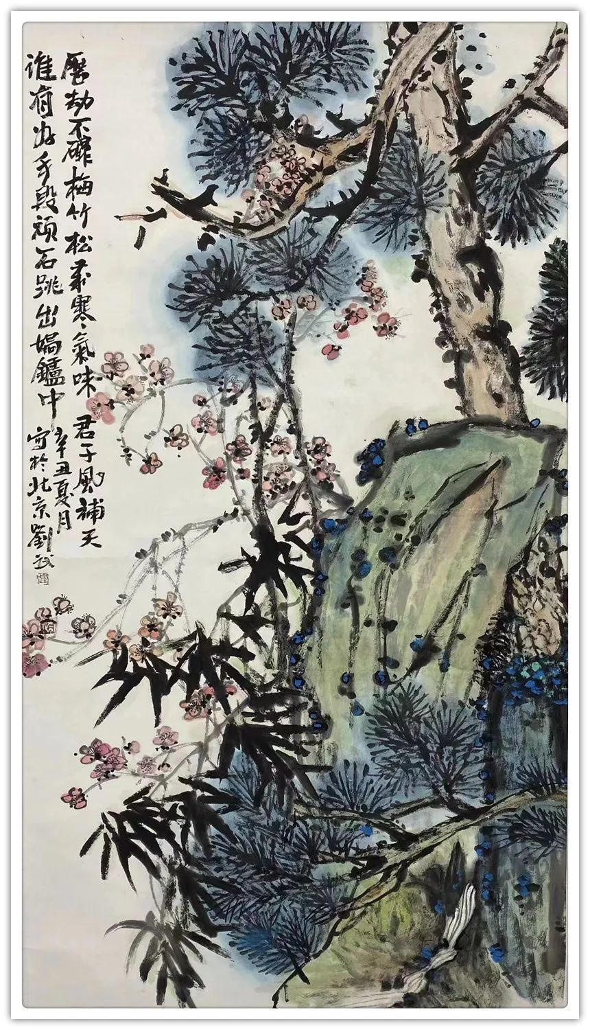 气韵生动,笔墨传神。画作是人的激情的宣泄,笔歌墨舞,淋漓酣畅,一气呵成。意境是中国画追求目标,意境高远一直是文人画艺术引以自豪的东西。对意境的追求使中国人从一开始便舍弃单纯的“形似”,努力追求“神似”。画气写神驾驭笔墨,以展意境的创作理念是刘武先生写意花鸟画的思想源泉,他把情致,笔墨章法等要素有机结合 形成大统,虽然题材为梅兰竹菊,牡丹等花卉,草木禽鱼,但画风沉雄恣肆的笔法,旷达舒展的构图率真苍浑的气象无不构成气息鲜活,韵致爽雅的画面,恰到好处与书跋印浑然一体全无泥古不化之气,充满悠悠神韵,让人赏心悦目。
